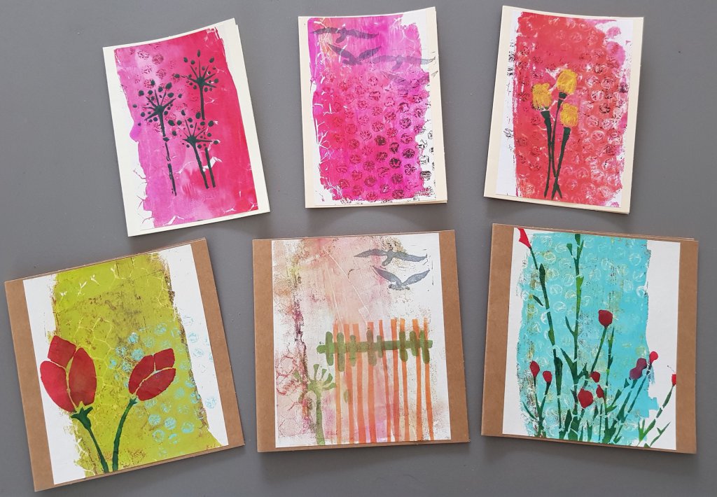 Afgelopen week heb ik weer wat kaarten gemaakt met de gelli plate en ook weer wat stempeltjes gemaakt van zelfklevende foamvellen, ik plak ze dan op wat dikker plastic zodat je precies kan zien waar je stempel komt.