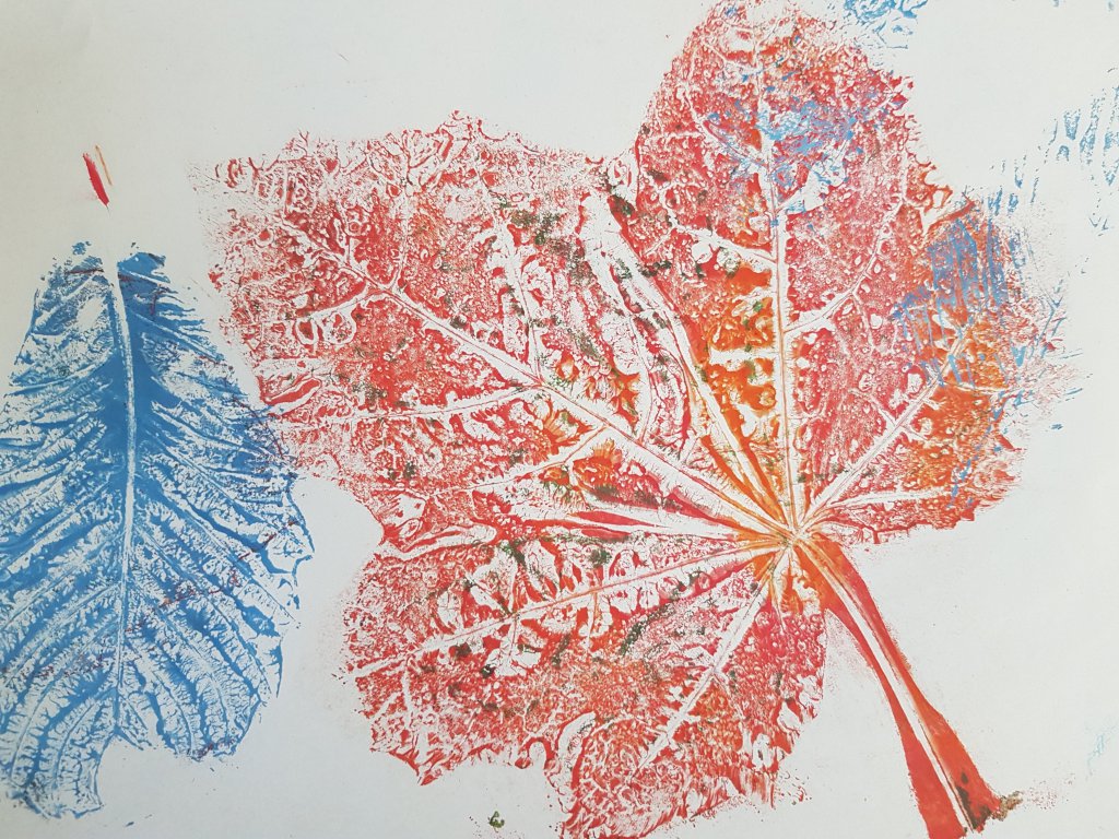 Agnes wilde weten hoe ik de afdrukken met de bladeren had gemaakt, dus kwam ze gisterochtend gezellig meedoen. Ze had zelf een paar mooie bladeren meegebracht waarmee we lekker hebben zitten spelen.