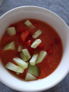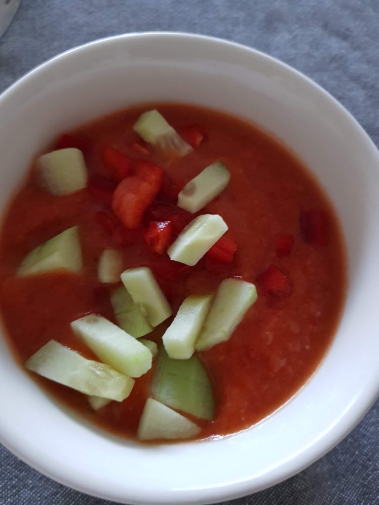 Snijd 500 gram tomaten, een halve komkommer en een kleine rode ui in grove stukken en doe ze met 1 teentje knoflook, 3 eetlepels rode wijnazijn en 50 ml olijfolie in de blender of keukenmachine. Voeg wat peper en zout toe en voor wat pit een beetje chilipoeder. Laat de machine draaien, voeg dan een halve pot gegrilde paprika’s toe en laat nog even draaien. Vaak wordt nog wat brood toegevoegd maar dat heb ik deze keer niet gedaan. Ik heb een Magimix 3200 en daar ging het prima mee. Laat de soep minstens een paar uur goed koud worden en serveer hem in niet te grote schaaltjes. Zet wat bakjes met kleingesneden komkommer en paprika op tafel om toe te voegen en geniet.