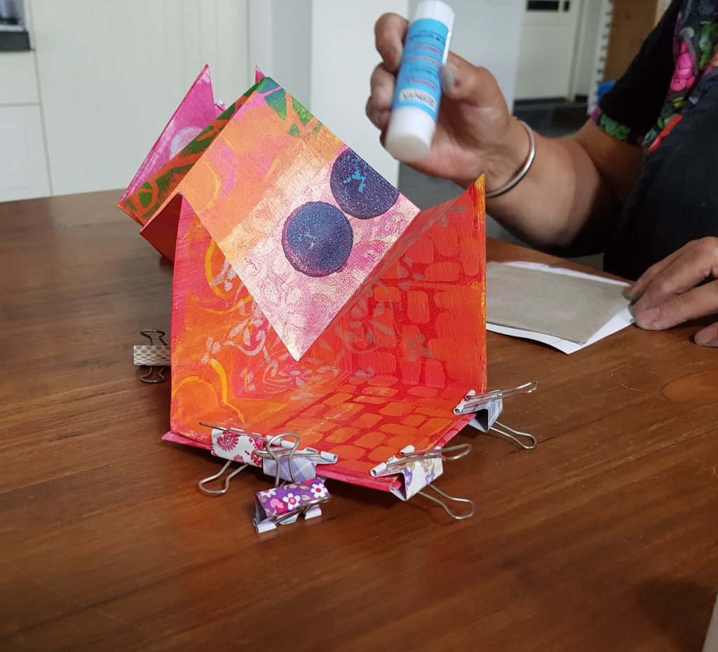 We komen nu 1 x per maand bij elkaar met een groepje vrouwen en noemen de groep Achterdoek. Afgelopen dinsdag hebben we eerst vliesofix geverfd en daarna heb ik de dames voorgedaan hoe ze een boekje maken van gekleurd of geverfd papier. Het opgestreken vliesofix geeft leuke resultaten op stof, helaas had ik een ander soort vlies wat niet zo goed werkte voor dit doel, gelukkig kan ik het wel voor de normale toepassing gebruiken.