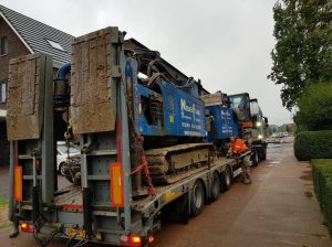 Het regende vanmorgen hard, dus alles was erg modderig. Toen we kwart over 10 gingen kijken waren de mannen al aan het opruimen, we hebben de actie dus gemist. Er hoefde niet geheid te worden, maar er zijn schroefpalen ingegaan.