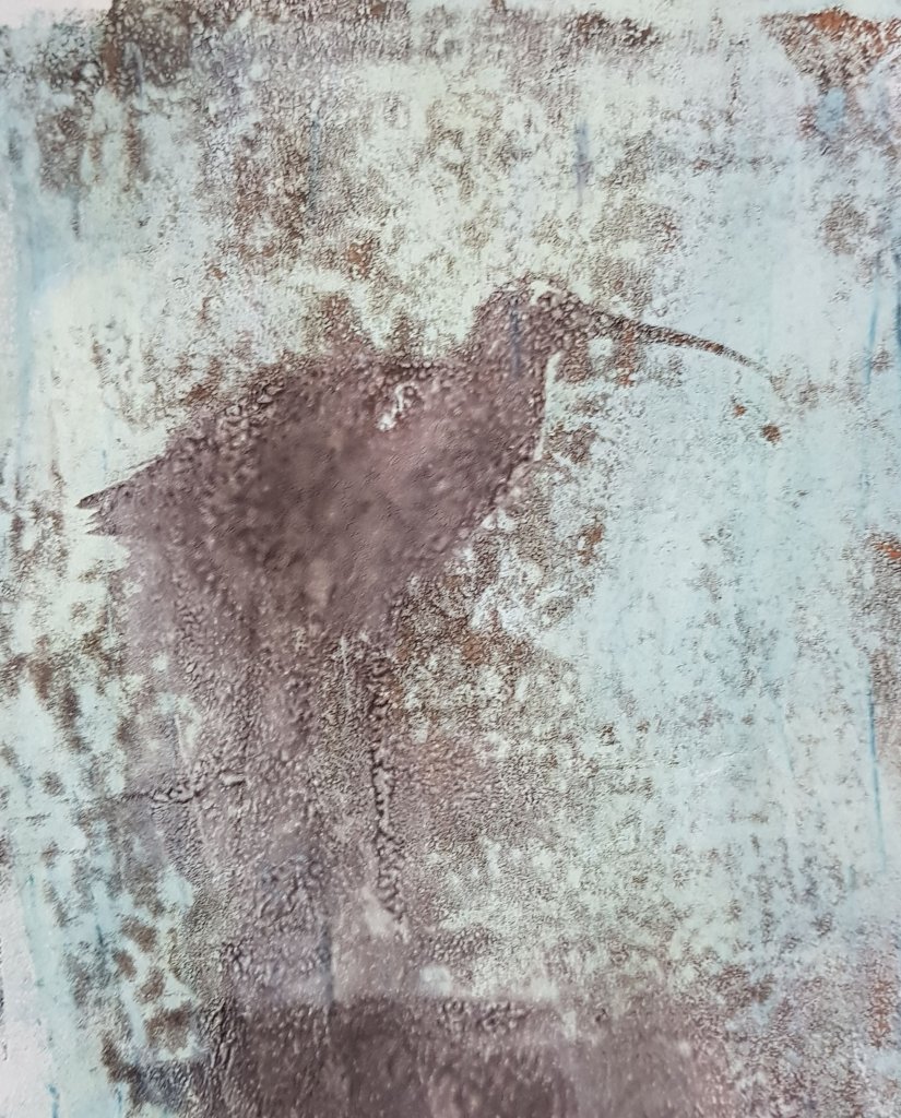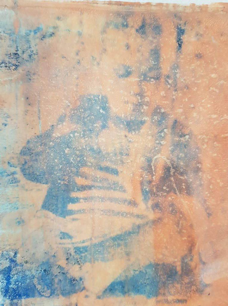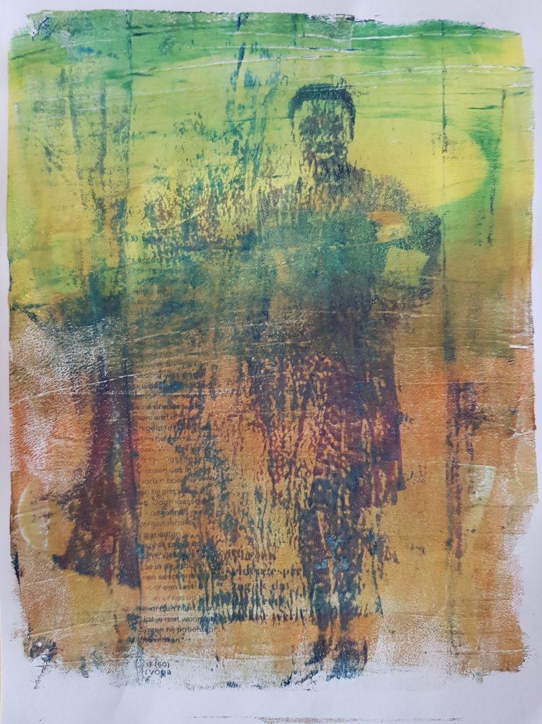 Het is mogelijk om plaatjes uit tijdschriften af te drukken op papier met behulp van de gelli plate, alleen weet je nooit van tevoren of het lukt. Als het dan lukt is het een leuke verrassing. Dit is een plaatje uit de Libelle: