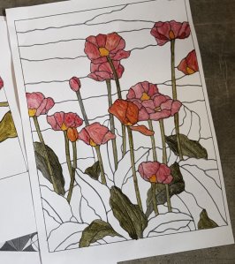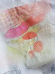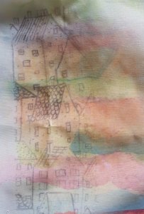 Helaas kunnen we nu niet met ons groepje Achterdoek bij elkaar komen, 6 personen is te veel en ook mogen we niet in het zaaltje omdat het beschouwd wordt als een kantine. Gelukkig mag je nog wel met 3 personen bij elkaar komen en zo zijn Ine en ik afgelopen dinsdag bij Agnes geweest om te werken met transferverf. Jaren geleden heb ik een workshop gevolgd van Sandra van Velzen en ik had nog aardig wat verf over en bedrukte vellen. Agnes had ons gevraagd van tevoren wat tekeningen te printen en eerst zijn we begonnen de zwarte lijntjes over te trekken met de verf en de rest in te kleuren. Daarna maakten we op stof een achtergrond en streken toen de tekening hierop. De kleuren op de stof worden wel heel anders dan op het papier.