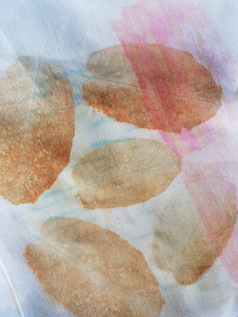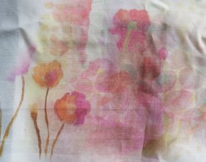 De stof moet minstens 60% synthetisch zijn, anders pakt de verf niet en je brengt de verf al bewegend met je strijkijzer over op de stof met bakpapier ertussen. Agnes had ook wat bladeren ingesmeerd met de verf. Je kan de vellen geverfd papier wel 7 tot 8 keer gebruiken, al wordt de afdruk dan steeds lichter.
