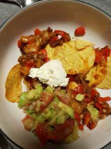 ‘s Avonds smulden we van een lekkere ovenschotel met nachos en gehakt. Fruit hiervoor een rode ui in olijfolie, voeg 200 gram rundergehakt toe en 2 teentjes fijngehakte knoflook, een gedroogd pepertje of wat sambal, flink wat paprikapoeder en een theelepeltje komijnpoeder en bak dit tot het gehakt rul is. Voeg dan 1 eetlepel tomatenpuree toe en een rode paprika, in kleine stukjes gesneden, laat alles 10 minuten stoven. Verwarm de ovengrill, vet een ovenschaal in en verdeel hier een halve zak tortillachips over, schep het gehaktmengsel erop en bestrooi het geheel met flink wat geraspte cheddar. Laat de kaas onder de grill smelten. Serveer met crème fraîche en guacamole.