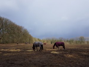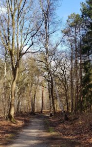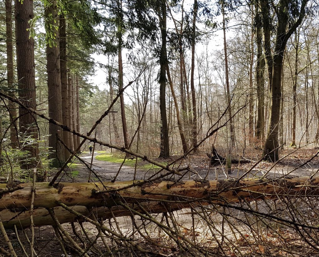Gisteren liepen we de trage tocht Renkum, deze hadden we in oktober ook gelopen en vonden we toen erg mooi, ook in de winter is hij aan te bevelen. We zagen op buienradar dat er af en toe een bui kon vallen en hadden dus onze regenjacks met capuchon aangetrokken, maar dat we 4 x een hagelbui op ons hoofd zouden krijgen hadden we toch niet verwacht. Het begon al toen we net uitgestapt waren, gelukkig duurde deze niet zo lang en al gauw scheen de zon weer. Het waaide flink, vooral tijdens de buien was het stormachtig en daarom hadden we  een tocht uitgezocht waarbij we veel in het bos liepen.