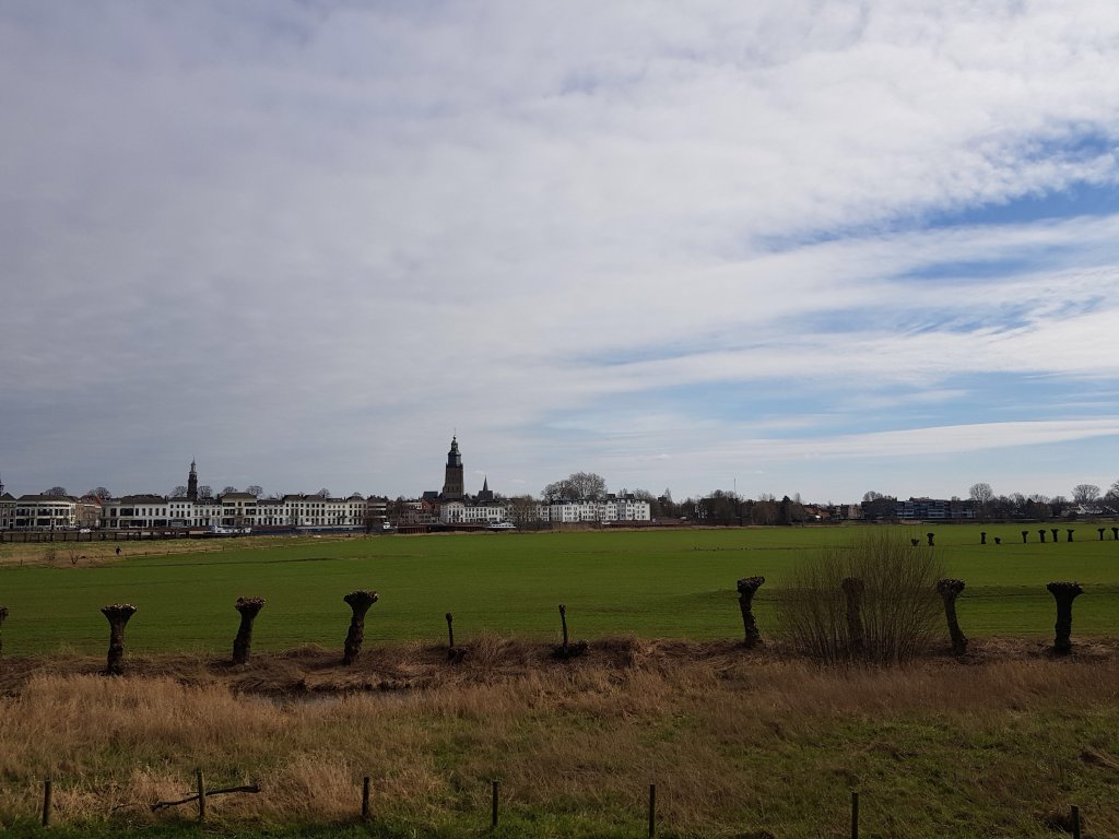Daarna liepen we over een lang schouwpad en zagen we de toren van Zutphen al in de verte. Het was inmiddels zulk lekker weer geworden dat de jas uit kon. De contouren van Zutphen kwamen steeds dichterbij. Nadat we onder een viaduct doorgegaan waren liepen we al gauw door de Hoven en kwamen we bij de IJssel aan. Omdat we geen bankje zagen hebben we op de trap zitten lunchen, natuurlijk kwamen we even later langs diverse bankjes, maar hier zaten we ook heerlijk.