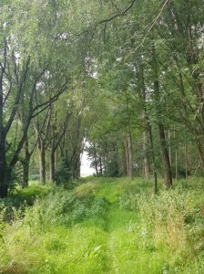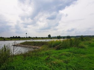 In de verte zien we Doesburg liggen. (als je op de foto klikt zie je het duidelijker). Nu volgt een stuk door de Havikerwaard, we lopen over grasland en langs sloten, via overstapjes en door populierenbosjes. De brandnetels staan hoog en zijn bijna niet te vermijden en als dat al lukt worden we wel geprikt door muggen, die hier volop aanwezig zijn. Het is dan ook niet verstandig om hier te rusten, dat doen we even later pas als we dit gebied uit zijn.