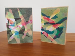 Er komen nog wel lamellen aan de buitenkant tegen het hoge raam, als bescherming tegen de felle zon, het raam ligt precies op het zuiden en ook prettiger voor de achterburen denk ik. Om te beginnen heb ik weer wat kaarten gemaakt met de gelli plate.