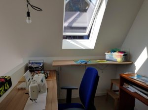 Donderdag konden we het tweede werkblad ophalen en vandaag heeft Aat het bevestigd. Dit blad is wat hoger dan het andere, ik vind het makkelijk om lapjes staande te snijden en ook het verven met de gelli plate doe ik graag staand, op deze hoogte krijg ik geen last van mijn rug.