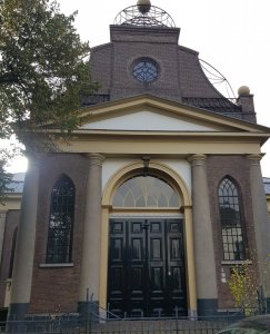 Nog een stukje langs een enorme vijver en toen waren we weer in Velp, waar we deze kerk passeerden met enorm hoge deuren.