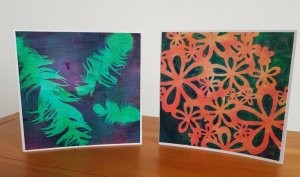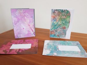 Natuurlijk heb ik ook weer kaarten gemaakt met mijn gelli plate afdrukken, dat blijft leuk om te doen. Bij enkele heb ik de enveloppen ook beplakt.