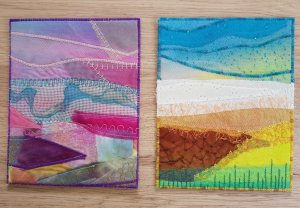 Collages gemaakt met diverse stukjes stof, ook organza en vastgezet met siersteken.
