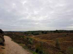 Ergens ging er iets mis, want op een gegeven ogenblik klopte de beschrijving niet meer, we zijn toen een heel stuk terug gelopen en hebben de bordjes gevolgd naar de Carolinahoeve, daar konden we de route weer oppikken. Heel veel brede beukenlanen verder kwamen we aan bij de Posbank, eigenlijk heet dit heidegebied Herikhuizerveld. Een prachtig gebied, ook al bloeide de heide niet meer, met veel jeneverstruiken, zelfs nog een paar bloeiende, grote brede bomen en prachtige vergezichten.