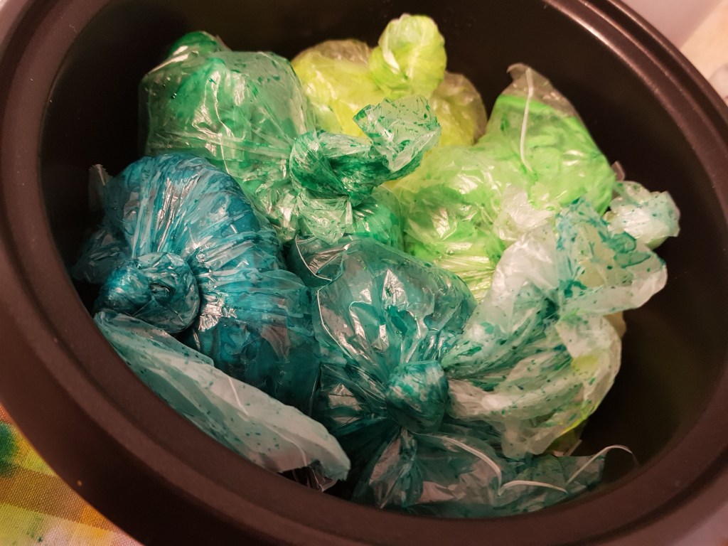 Gisteravond kon ik al een deel strijken en de rest heb ik vanmorgen gedaan, ik ben blij met het resultaat, wie weet ga ik binnenkort een andere kleurenserie doen. De verf is Procion MX, alles gekocht bij Stof tot verven en was best al oud, ik denk al een jaar of 6, maar zolang het poeder is blijft de werking gelukkig prima.