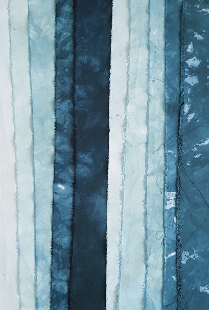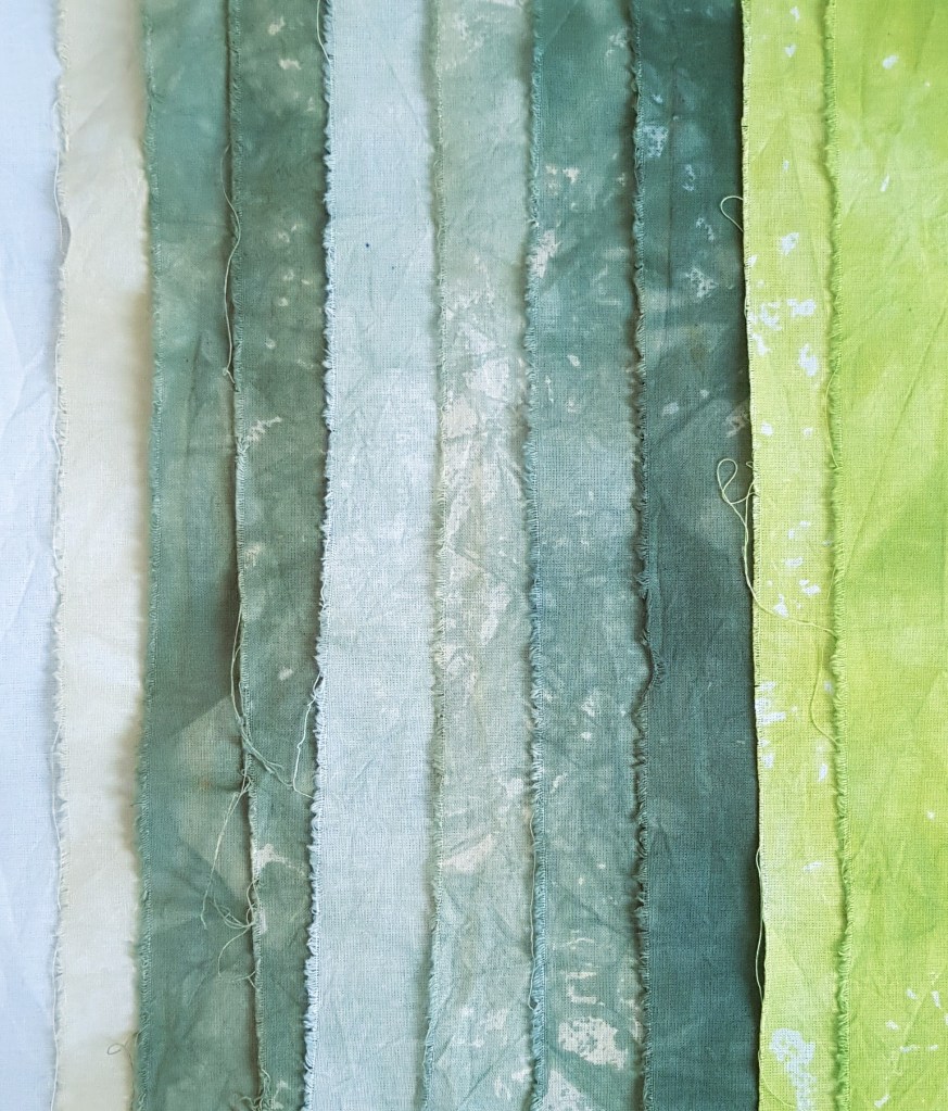 De rechter serie is wat lichter van kleur doordat die lapjes wat later toegevoegd zijn. Ik heb alles 4 uur in de rijstkoker gedaan, daarna kon het uitspoelen beginnen. Helaas kon ik nergens mijn potje kleurfixatie vinden, zodat ik wat vaker moest spoelen. Ik weet zeker dat ik nog een potje heb, maar waar het is? Vervolgens heb ik wat smallere lapjes in gradaties geverfd met barnsteen en azuriet, telkens in een andere verhouding.