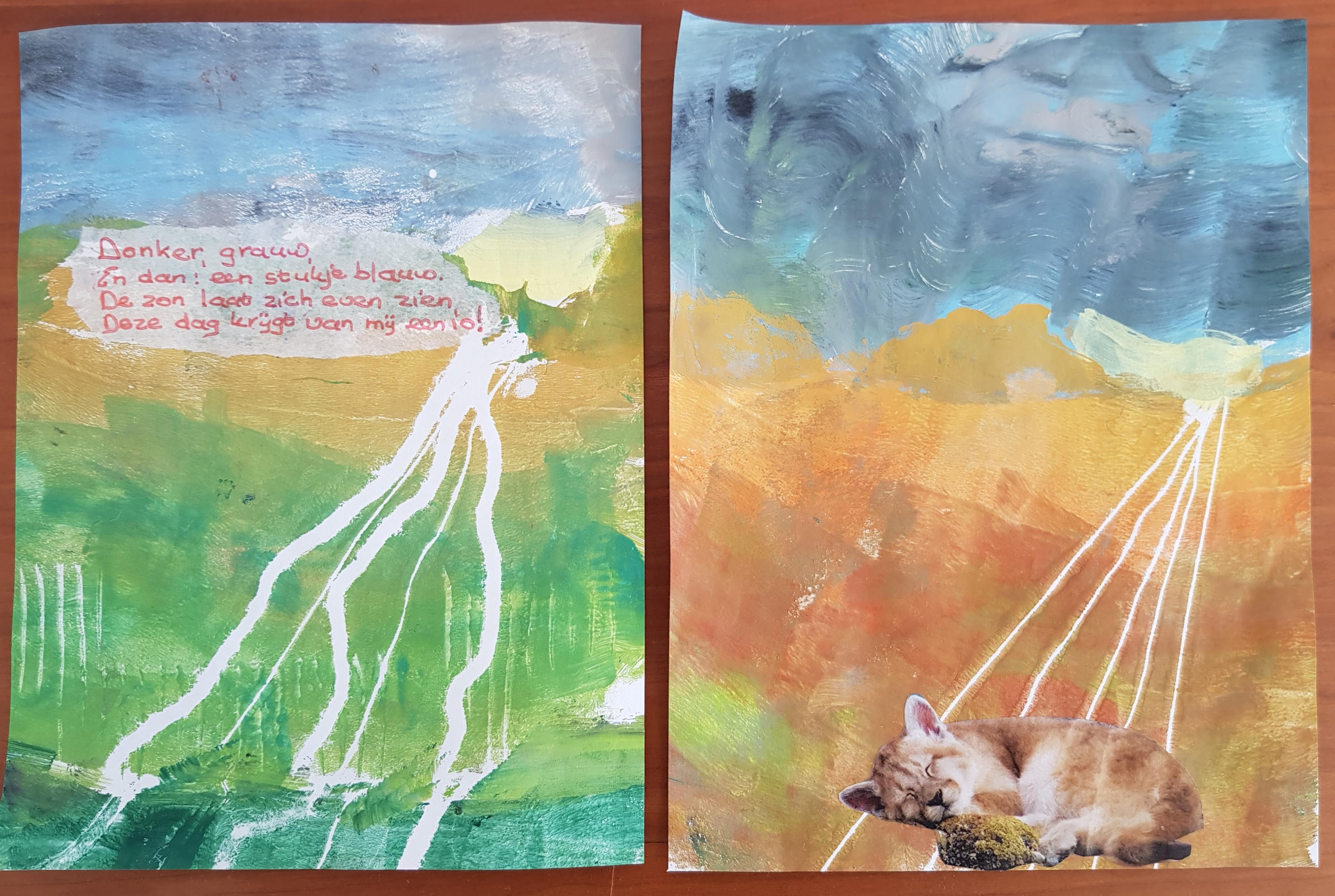 Ik heb meegedaan aan een online project van Christine van der Burg: het Juwelenboek. Ze heeft al vaker beeldboeken gemaakt, deze keer ging het over het weer: Weer of geen weer, en er werd met de gelli plate gewerkt.