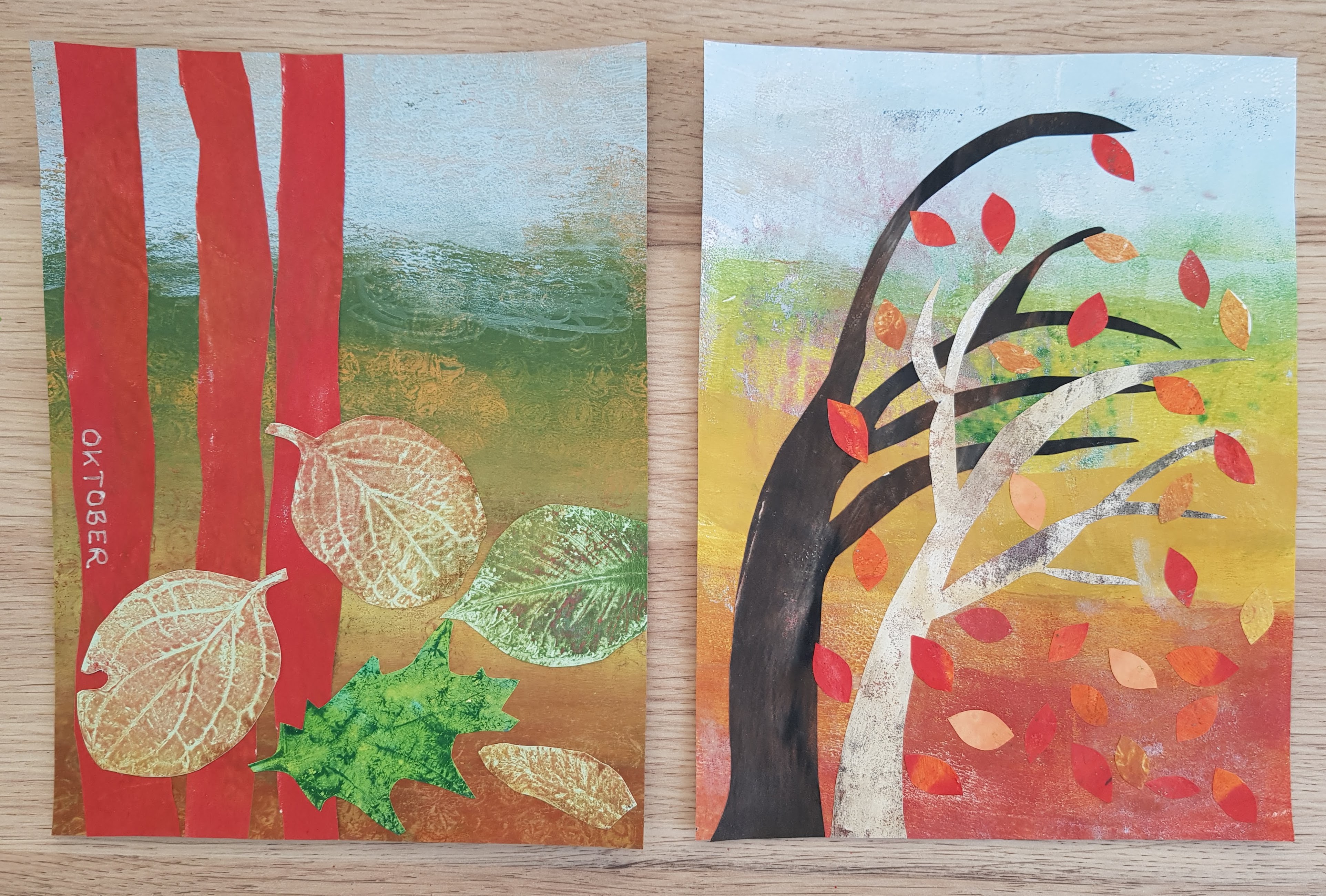 Hier was de tip om bladeren te scheuren en op te plakken, alles met de gelli plate geverfd.