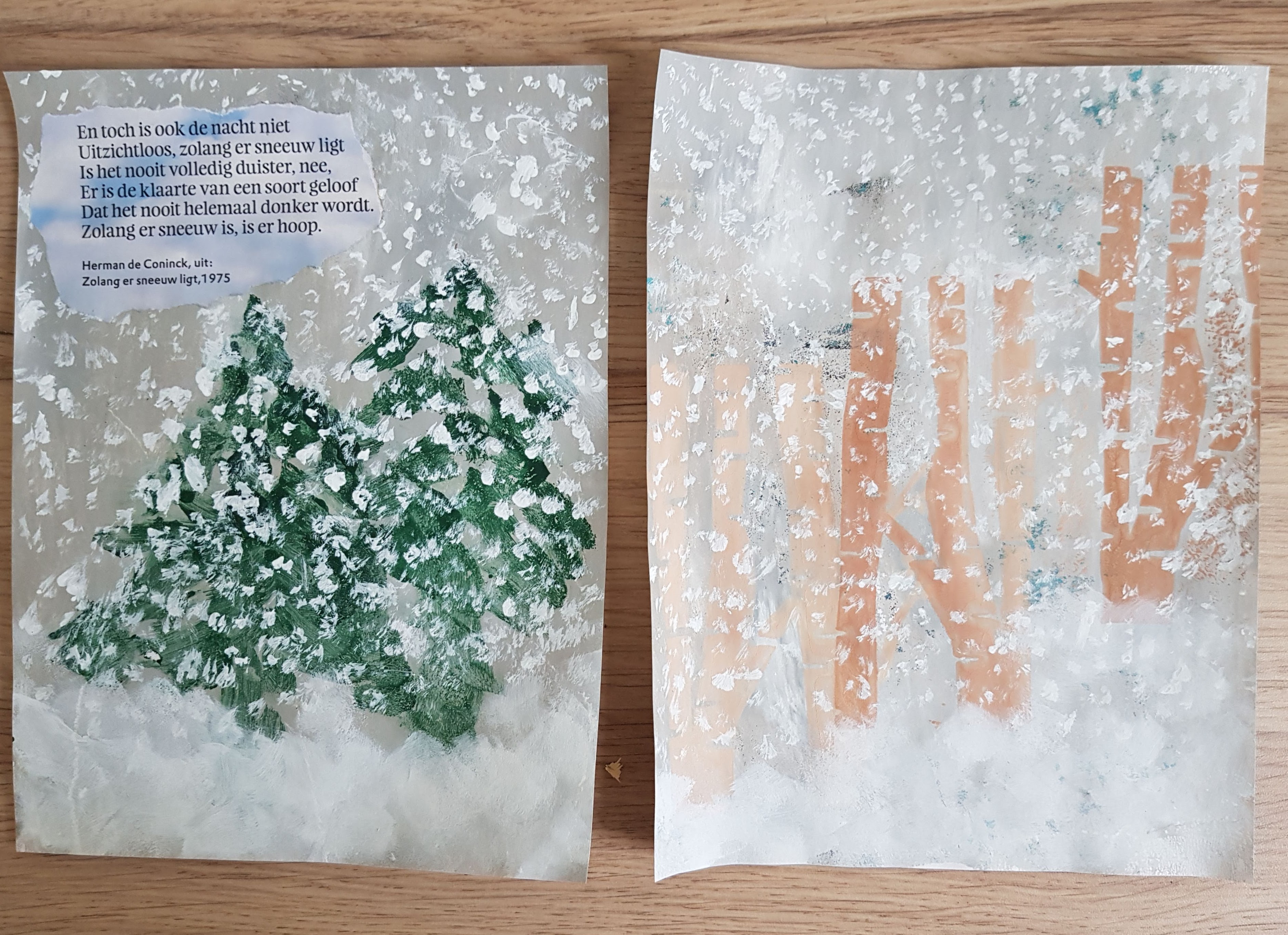 Een lichte ondergrond gemaakt met de gelli plate, links met een kwast en rechts met een stencil bomen erop en daarna met een sponsje sneeuwvlokken.