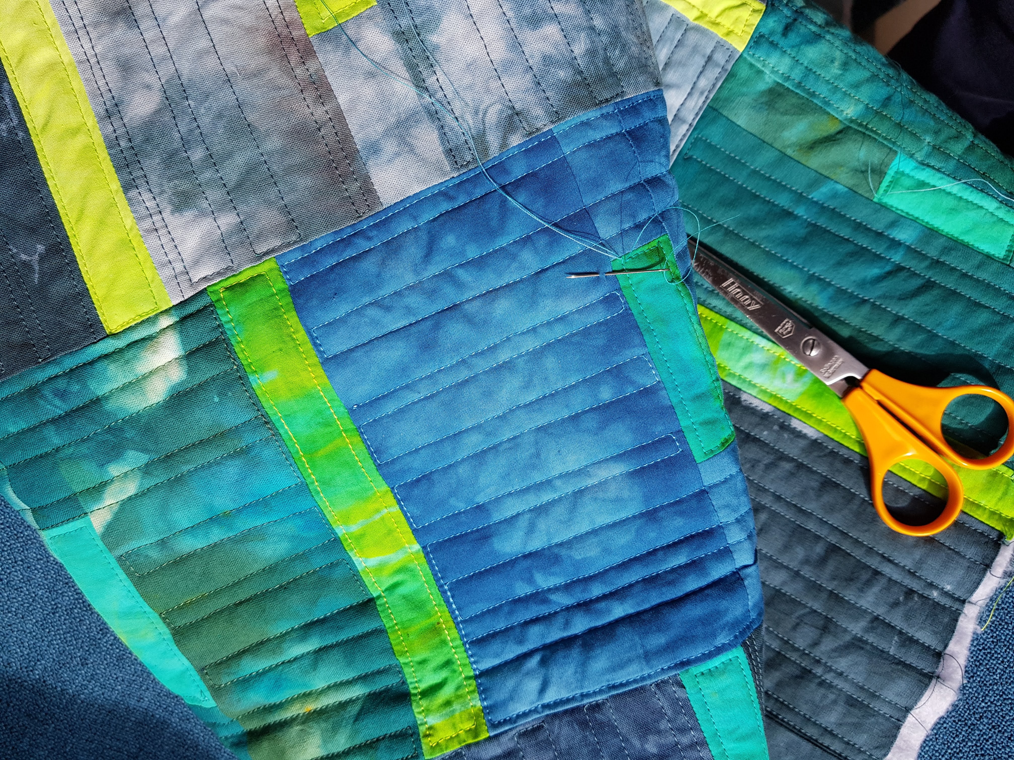 De blokken heb ik verbonden met smalle strookjes en toen ik er genoeg had heb ik ze aan elkaar genaaid. Daarna een mooie stof als achterkant uitgezocht, een dunne vulling ertussen en met rechte lijnen doorgequilt.