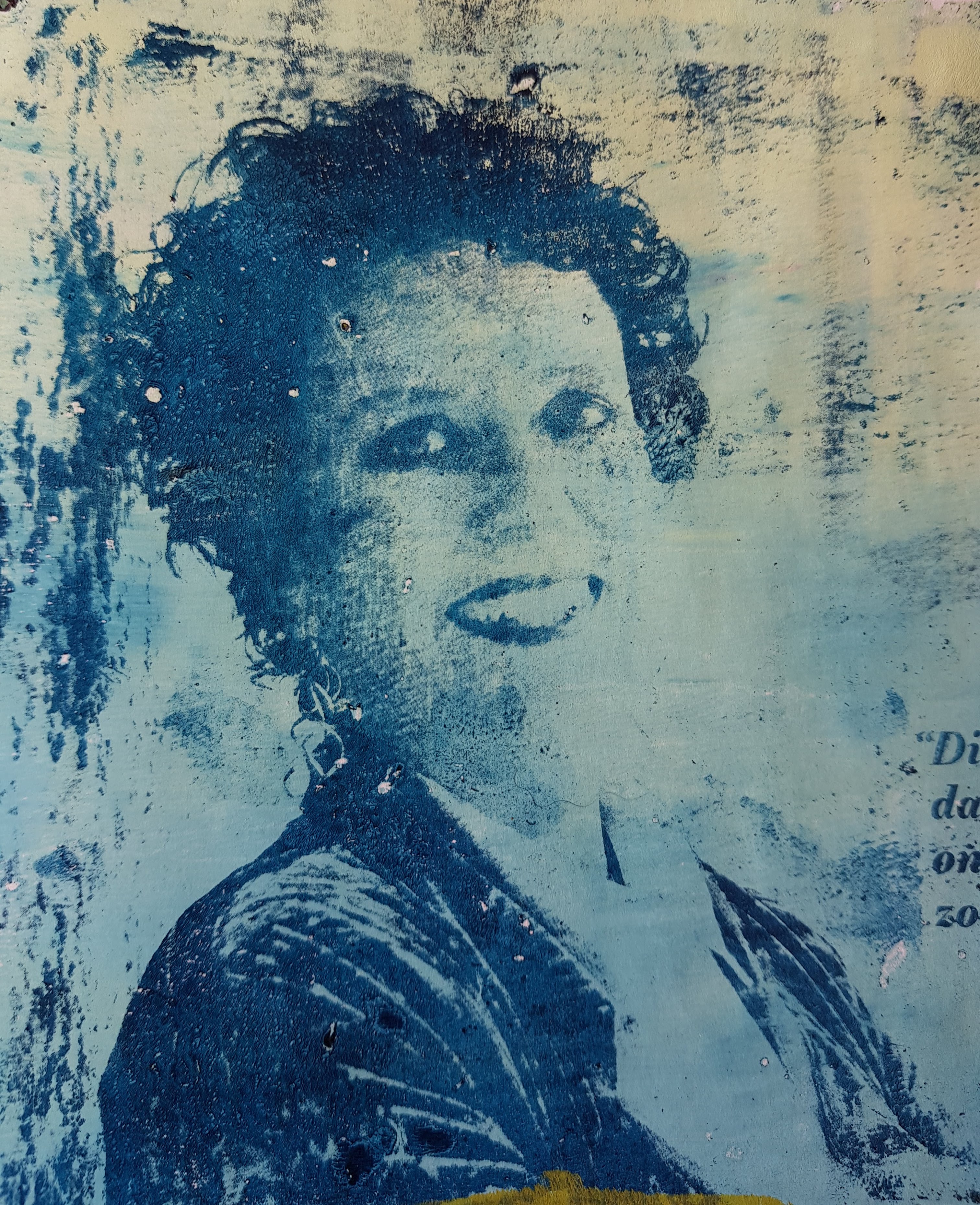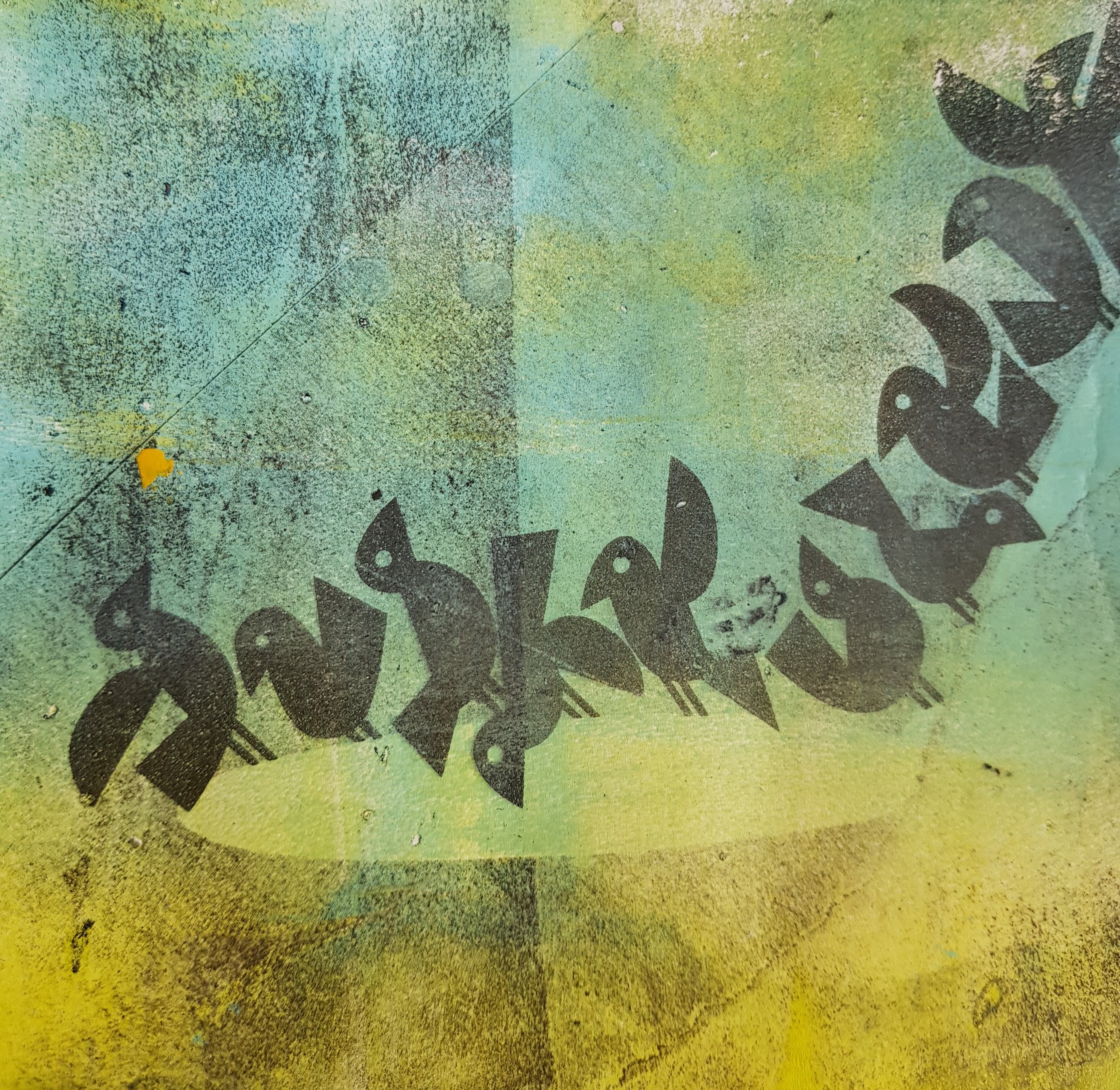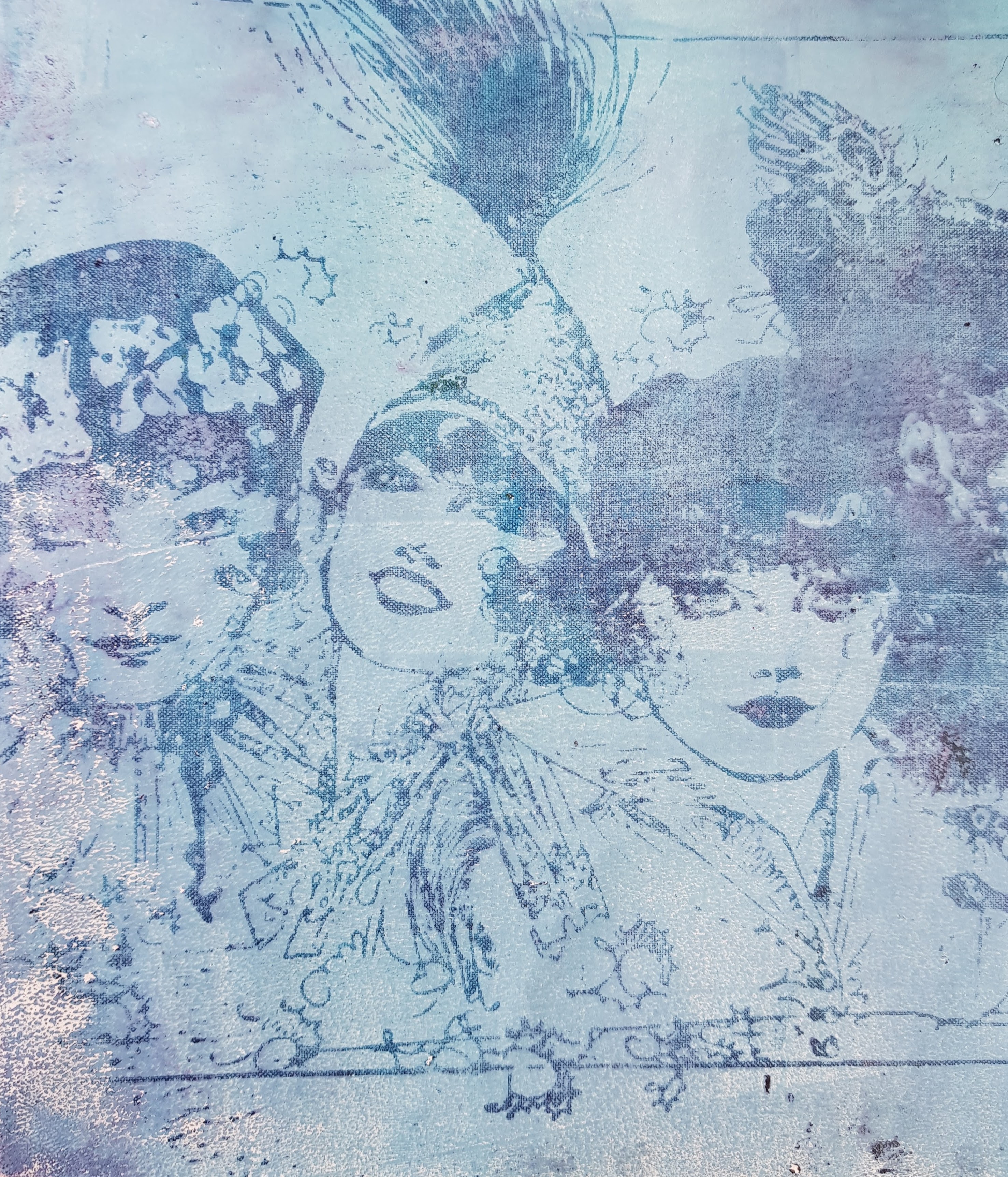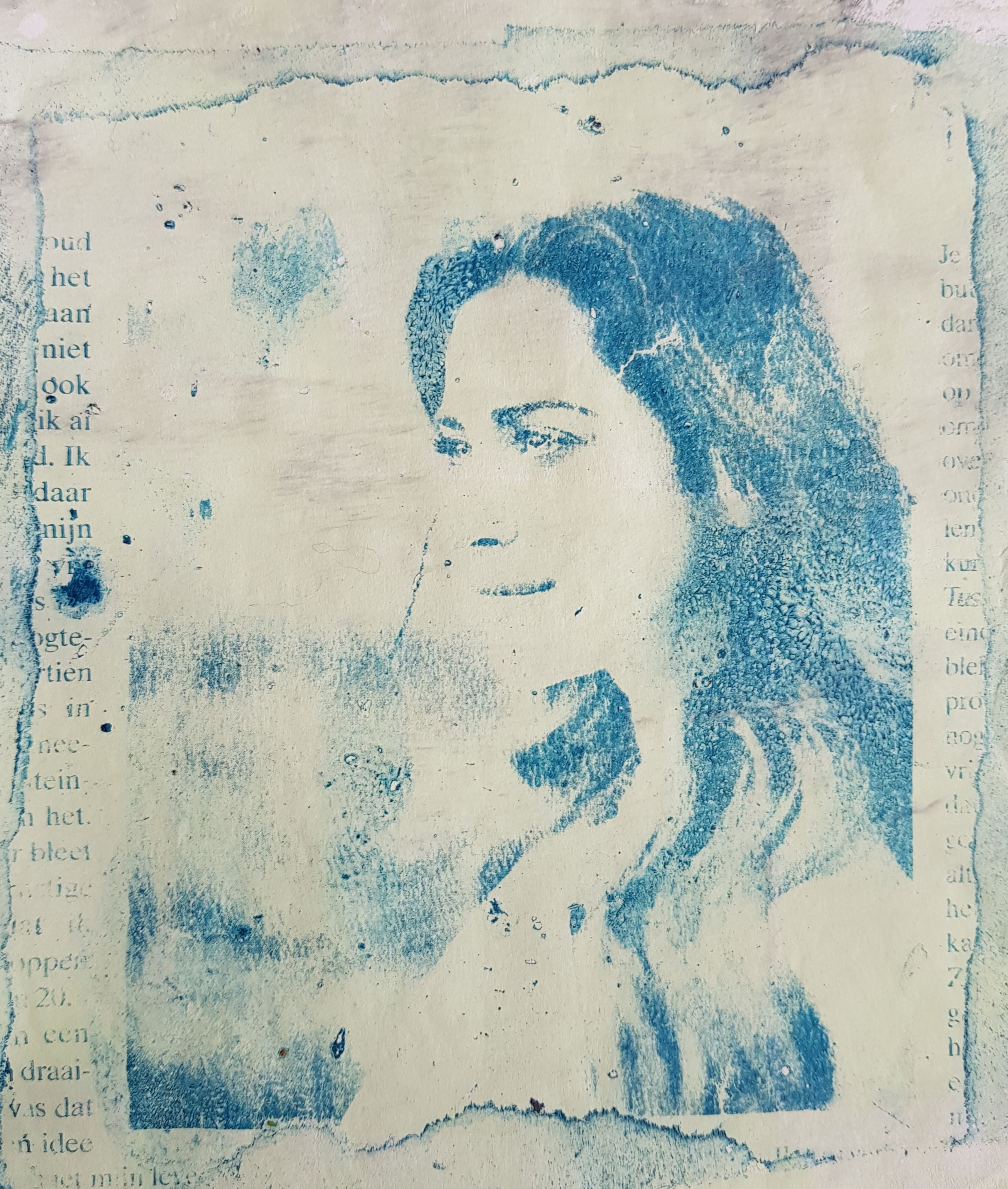 Het belangrijkste is dat de afbeeldingen een goed contrast hebben en dat je maar een heel dunne laag verf opbrengt op de gelli plate. Ik heb diverse merken verf gebruikt, maar dat maakte niet veel uit, de afbeeldingen komen ook uit verschillende tijdschriften, zoals de Libelle, Elle en Vogue, maar ook afbeeldingen uit Vogels of de Kampioen werkten.