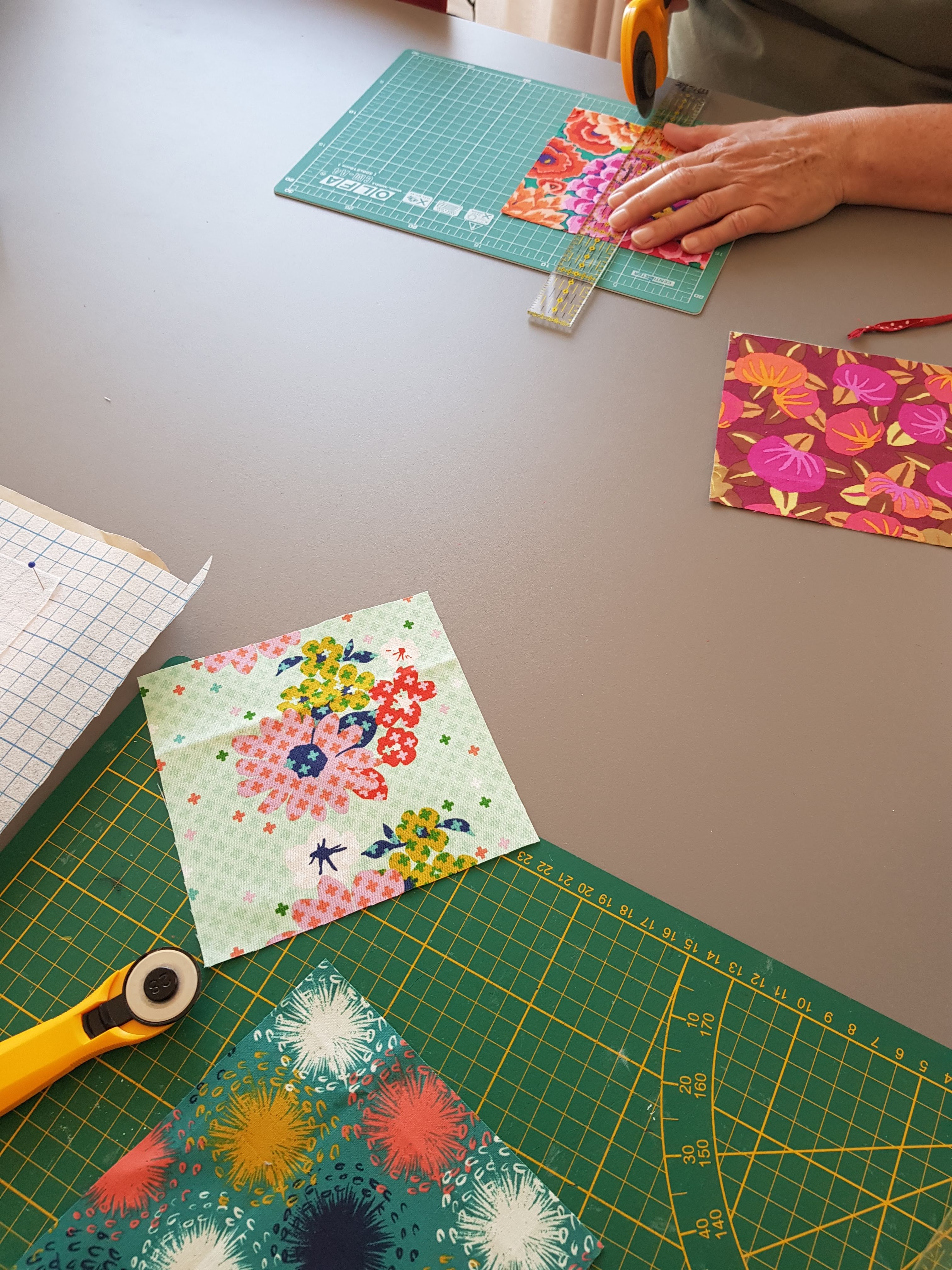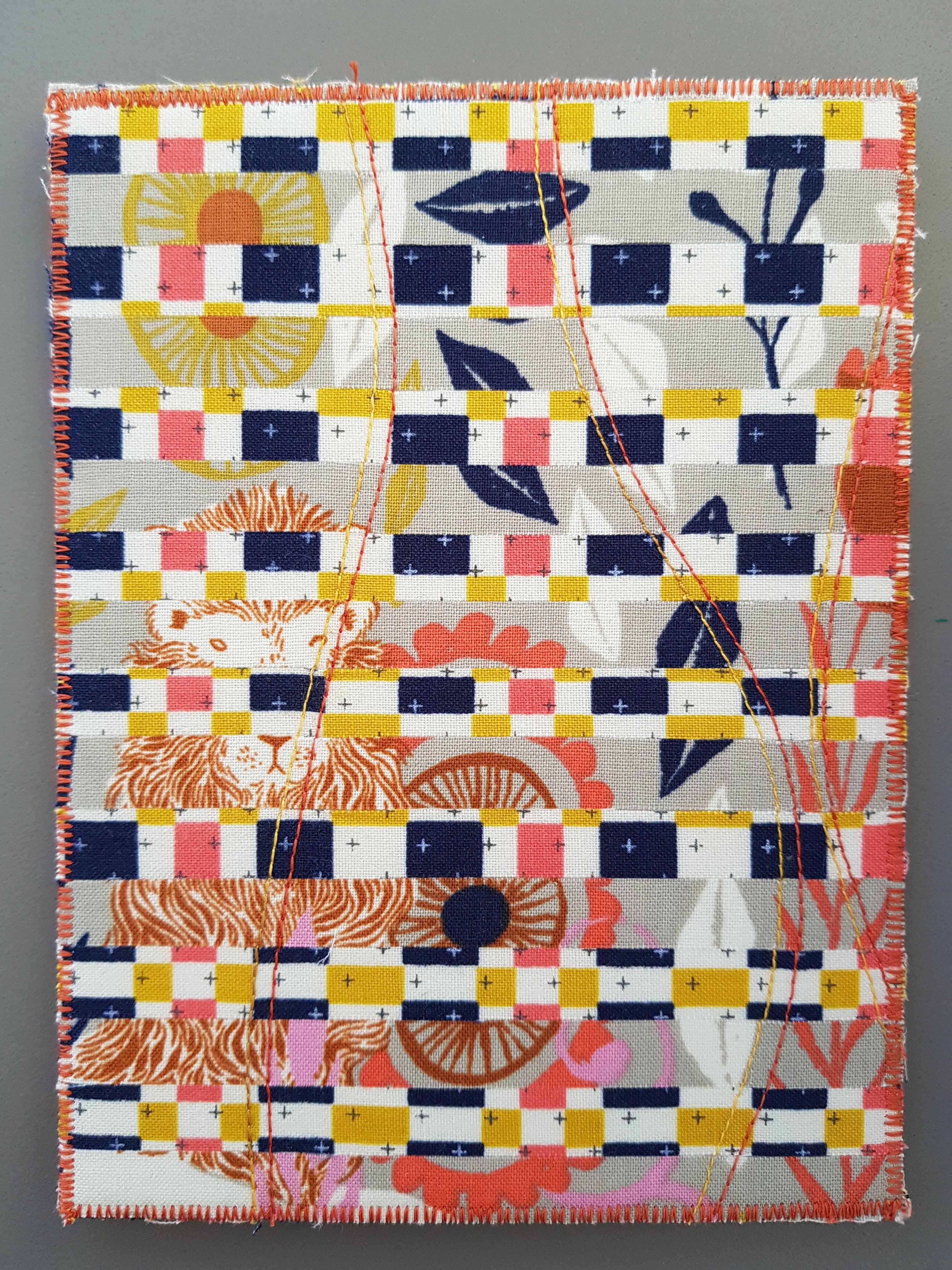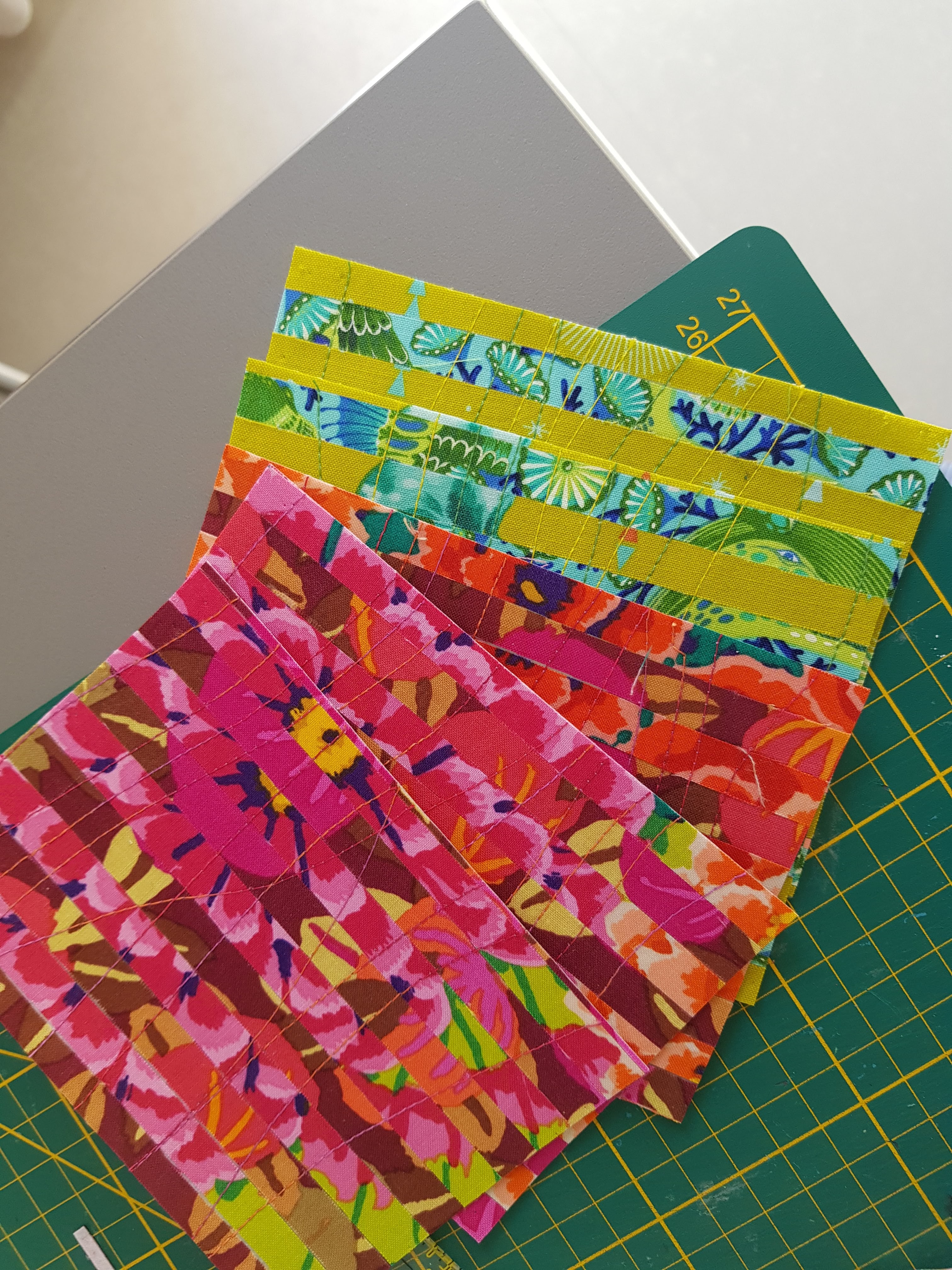 Het ruitjespapier diende om de strookjes goed recht te houden, maar ik heb hier eigenlijk niet op gelet. Vooral wat contrast in de stofjes geeft een leuk effect.