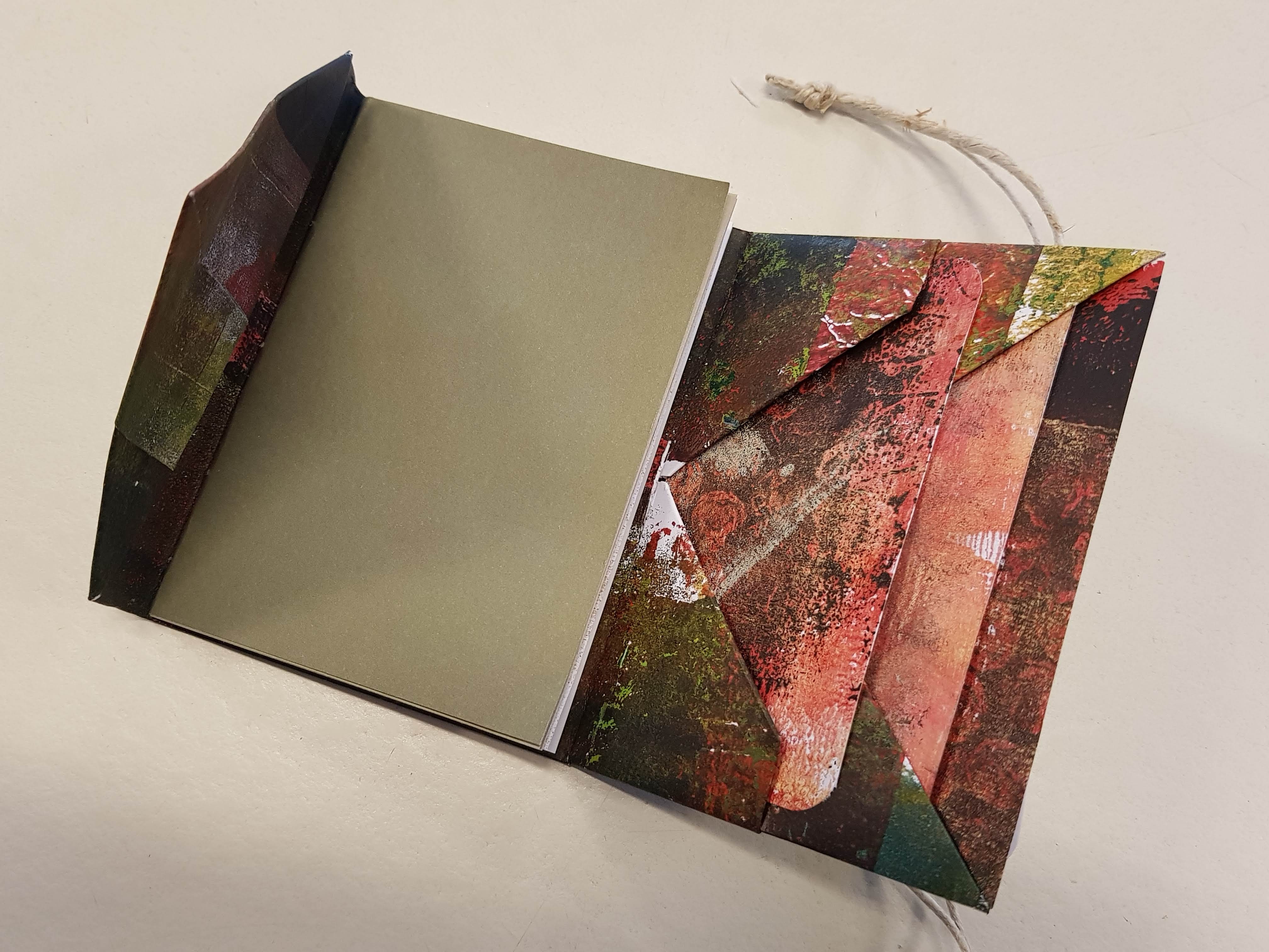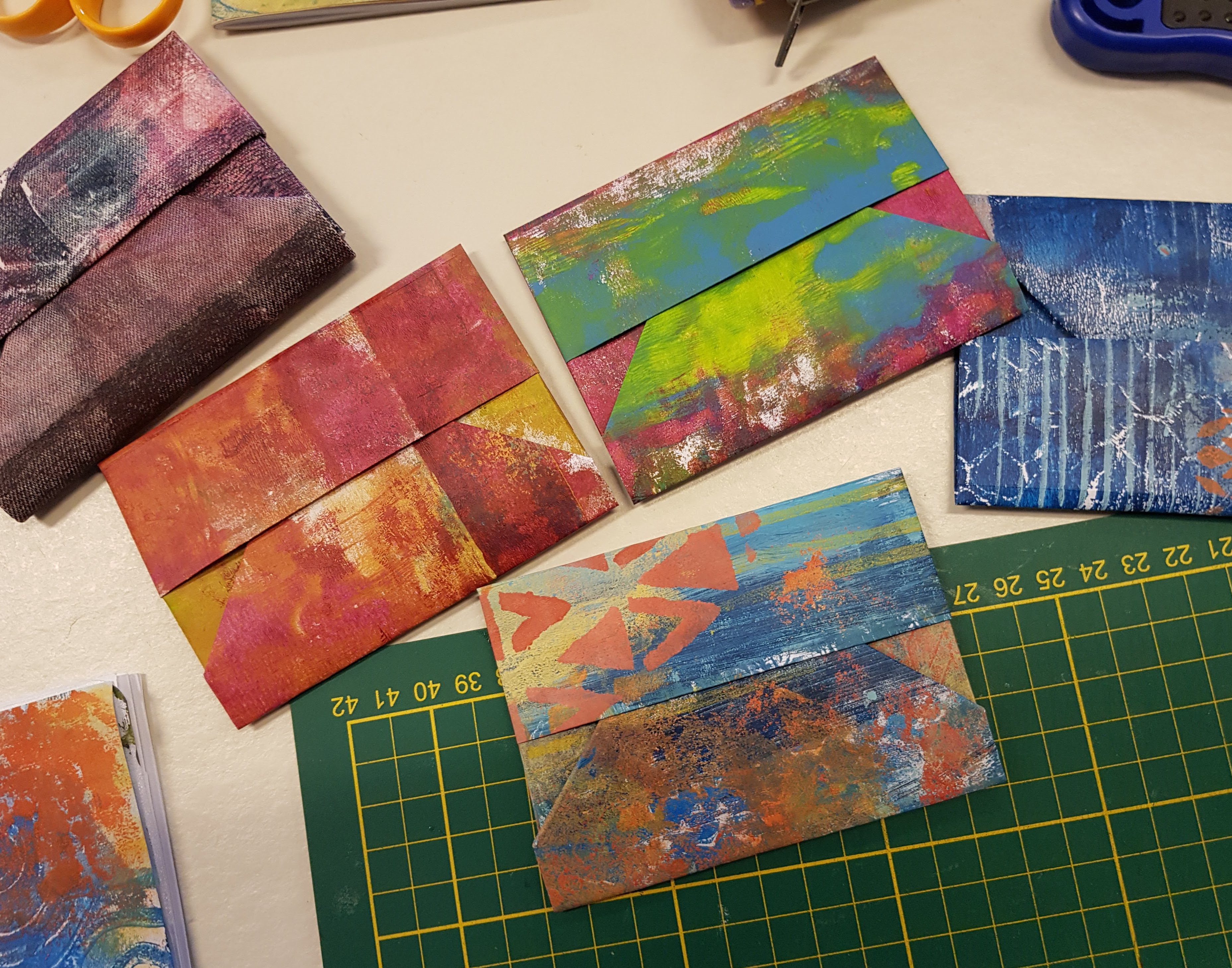 Vandaag had ik weer een bijeenkomst van Achterdoek en Eveline leerde ons boekjes en enveloppen maken. Ik had van tevoren een paar vellen bedrukt met de gelli plate, voor- en achterkant en ook wat afbeeldingen meegenomen uit een tijdschrift.