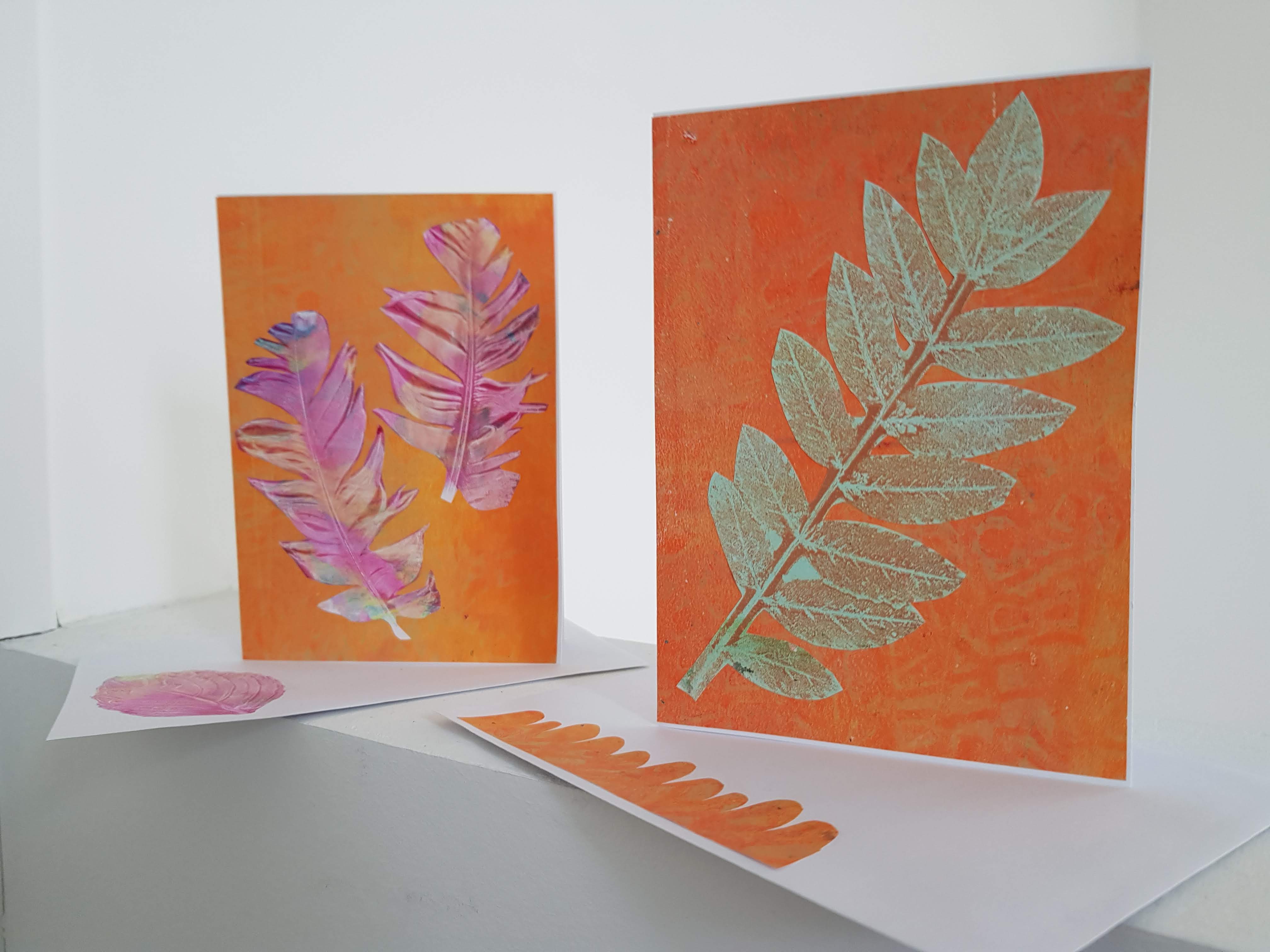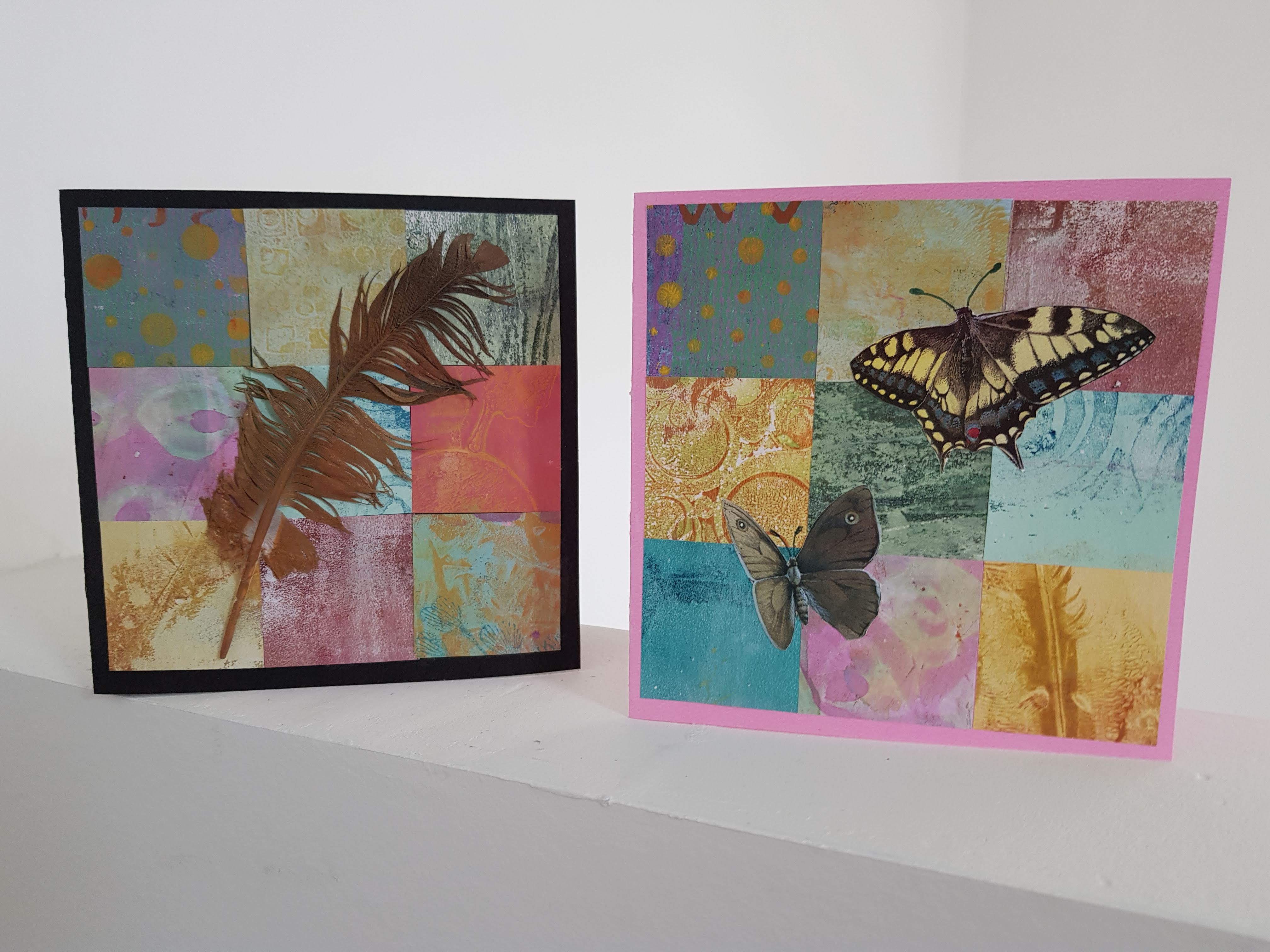 Doordat ik het zo leuk vind om de gelli plate te gebruiken heb ik ontzettend veel geprint papier. Op pinterest zag ik een idee om een patchwork ondergrond te maken van vierkantjes papier en zo heb ik een paar kaarten gemaakt. Wat plaatjes uit een boekje erop geplakt of een veer die ik bij het verven gebruikt had. Niet dat nu mijn stapel papier veel kleiner is geworden hoor.