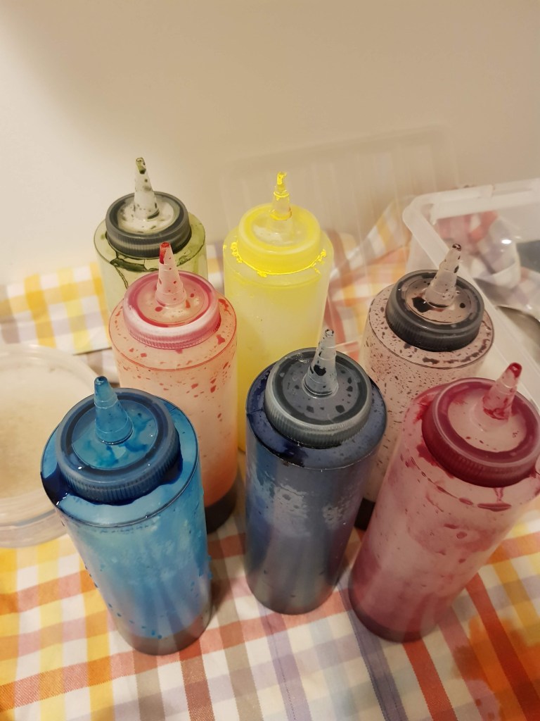 Daarna nog wat lapjes met diverse kleuren in potjes gestopt en ook een lap op plastic met een foamkwast ingesmeerd met verschillende kleuren.