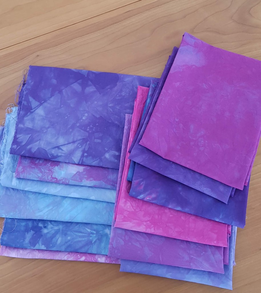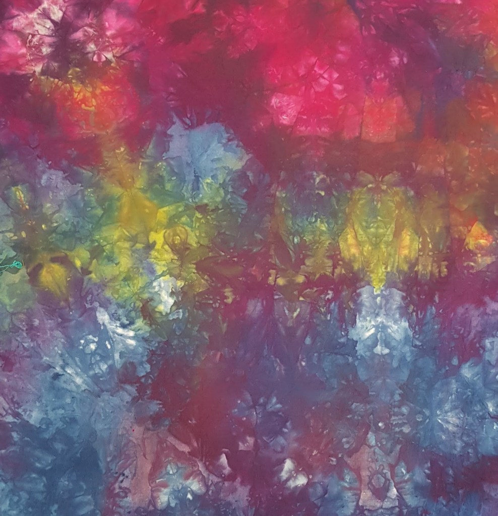 Vandaag zou het erg warm worden, prima weer dus om stoffen te verven, er is nl. warmte nodig om de verf goed te laten hechten. Verschillende verfoplossingen aangemaakt en lapjes laten weken in een soda-oplossing. Daarna alles in bakjes en lekker in de zon.