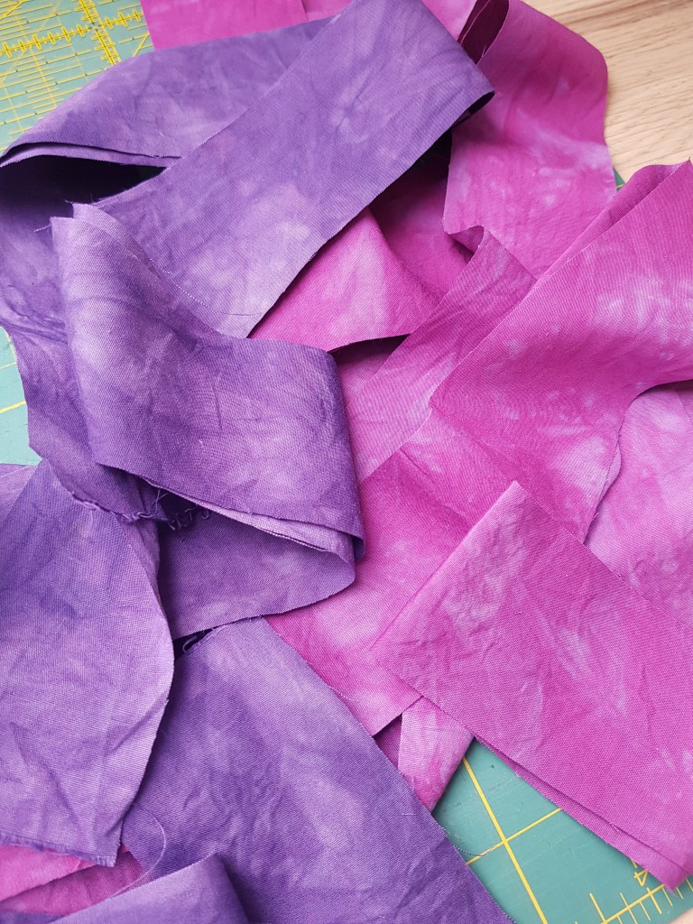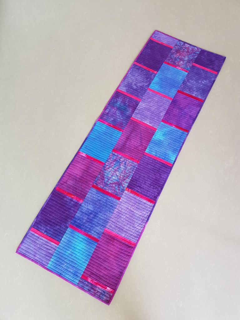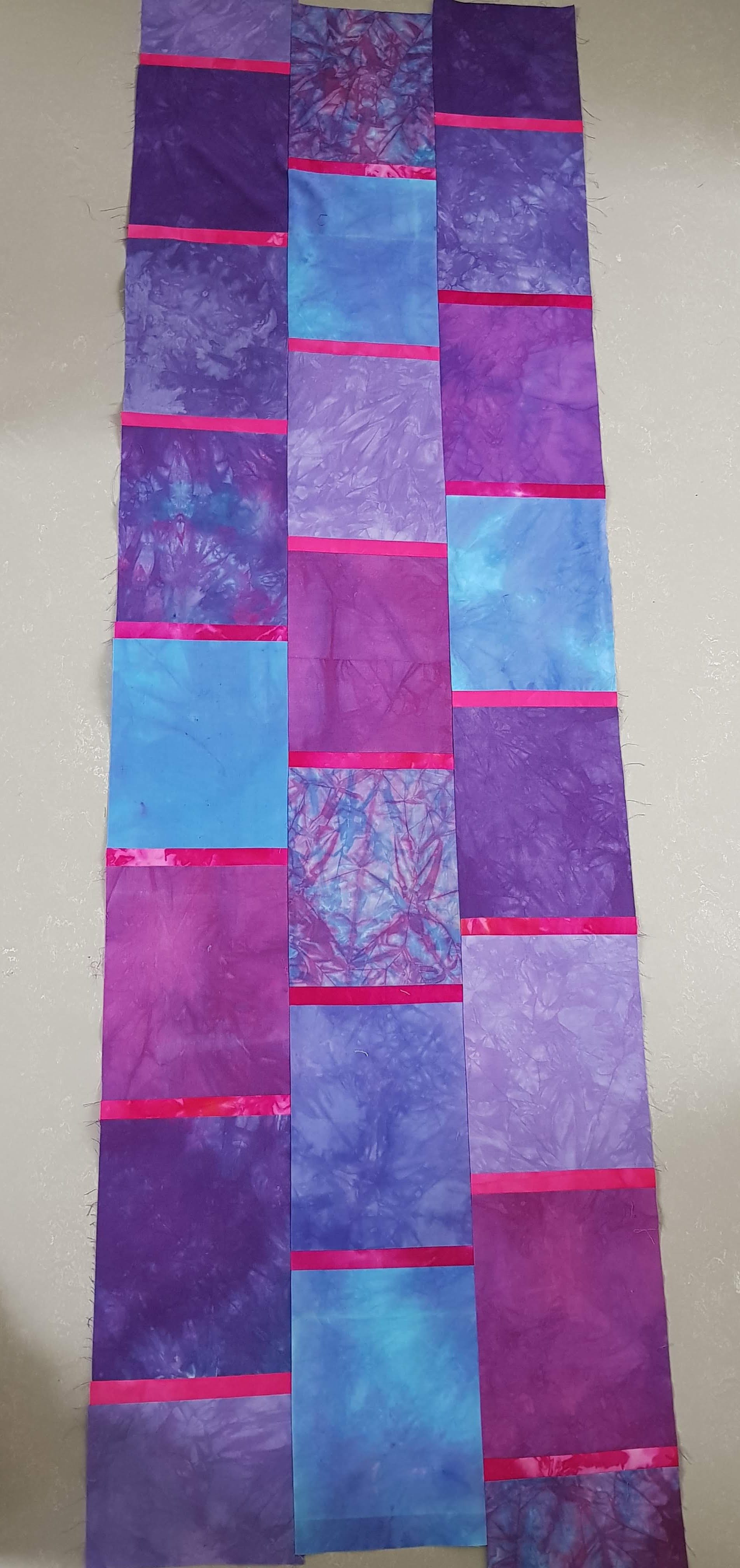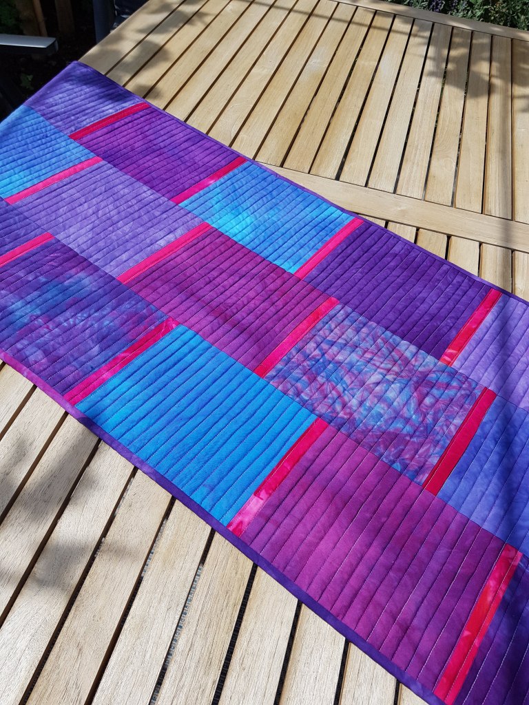 Voor schoondochter Natasha maakte ik een tafellopertje in dezelfde stijl als mijn eigen lopertje. Ze koos zelf de lapjes uit mijn stapel geverfde stofjes. Wel moest ik er nog een paar bijverven. Hier is de top klaar.