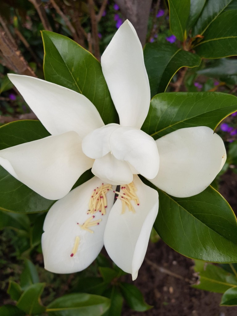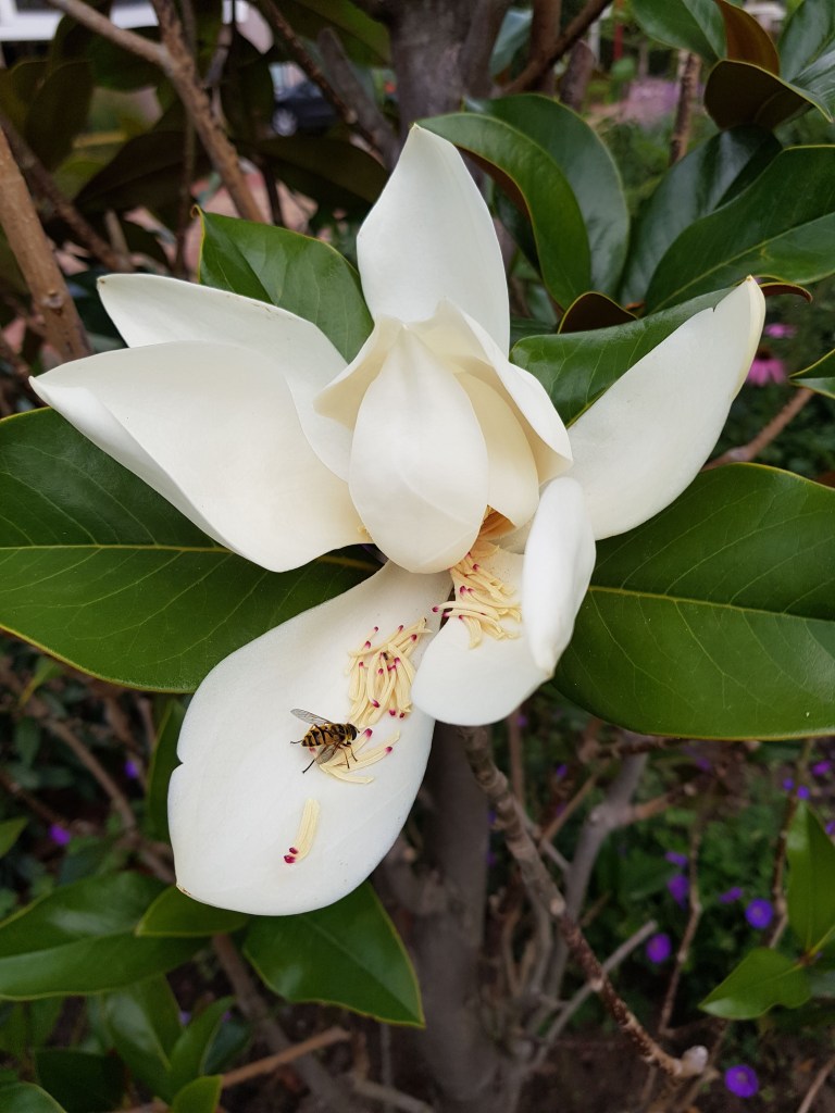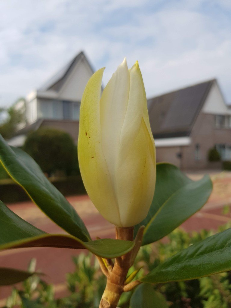 De meeste magnolia’s bloeien in april en mei, maar wij hebben een soort die nu bloeit. Dit jaar zitten er nog niet veel bloemen in, hopelijk worden dat er volgend jaar meer. Het is een Magnolia Grandiflora “Gallisoniere” waarvan de bladeren het hele jaar groen blijven en hij staat bij ons in de voortuin.