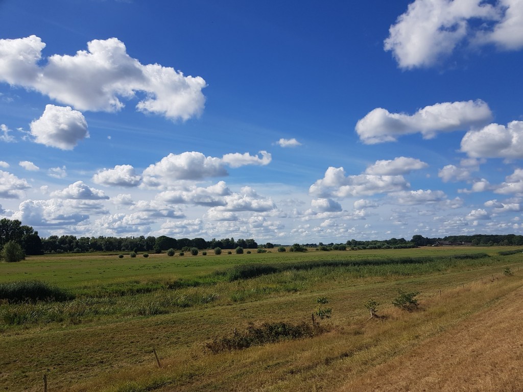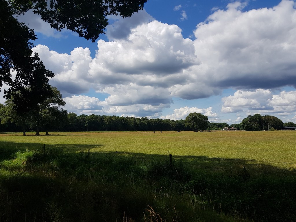 Vandaag hebben we weer heerlijk gewandeld vanuit Leuvenheim. Er zat alleen een saai stuk vlak langs de grote weg aan het begin, dat moet volgens ons wel te vermijden zijn. Verder was het een heel mooie route, die we wel een beetje langer gemaakt hebben, 17 km i.p.v. 14. Als je even niet oplet volg je een verkeerd bordje, ook waren sommige bordjes nauwelijks te zien door de begroeiing en moesten we weer een stukje terug. Maar ach, het was heerlijk weer en met mijn voet gaat het stukken beter.We begonnen met een prachtige wolkenlucht.