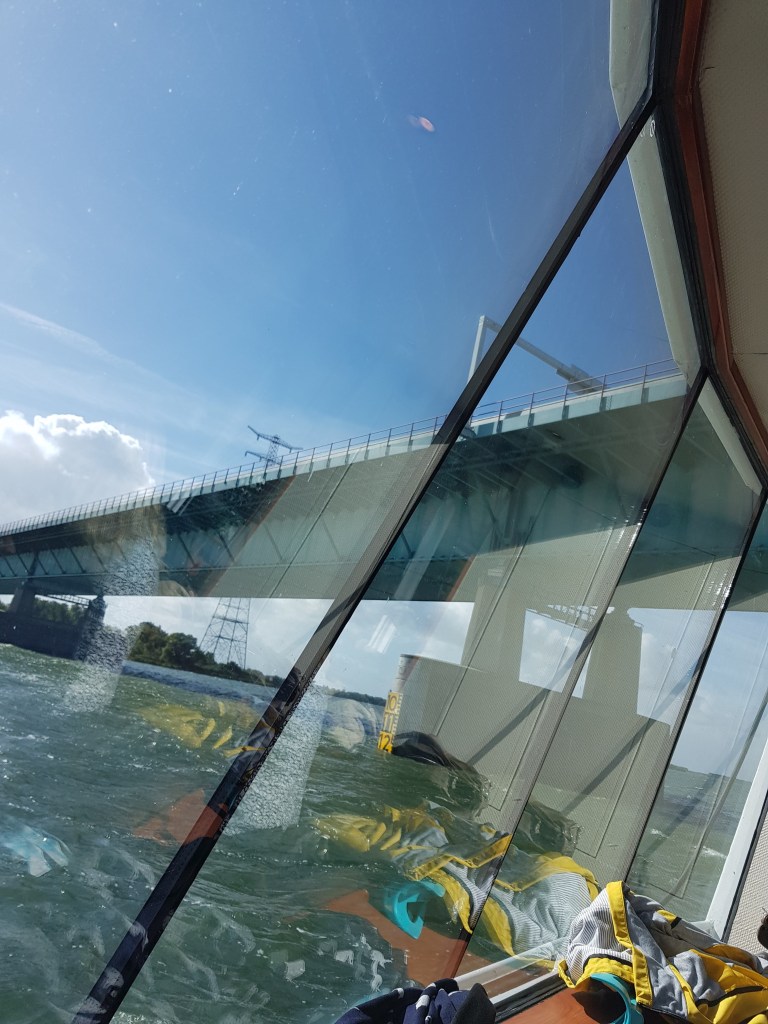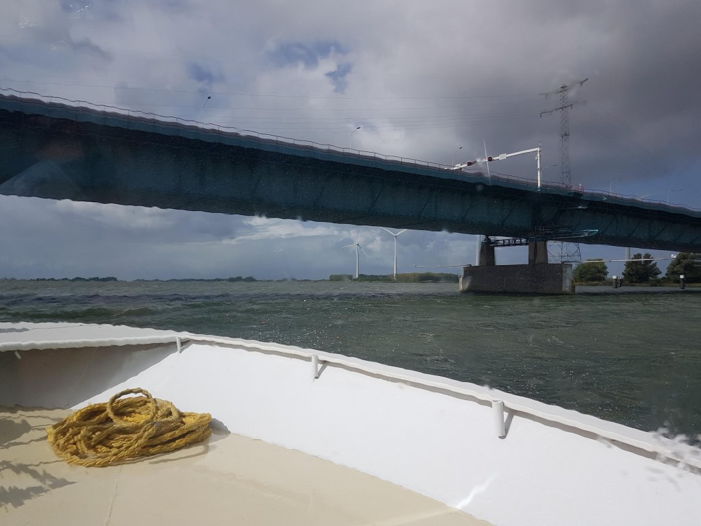 Ik zat op de Rijks-HBS, de laatste klas voordat het Atheneum en Havo werd, helaas zakte ik met nog een paar anderen en kwam in een zgn. bezemklas terecht. We waren met z’n drieën en alle 3 waren we gisteren aanwezig, heel gezellig, we hebben weer heel wat herinneringen opgehaald. Ik heb het altijd erg naar mijn zin gehad op die school, ik vond het indertijd helemaal niet erg om nog een jaartje over te doen. We hadden een tocht over het Haringvliet, maar we hebben zo druk zitten kletsen dat we nauwelijks iets gezien hebben, de boot had wat ons betreft net zo goed in de haven kunnen blijven liggen. Hier gaan we onder de Haringvlietbrug door.