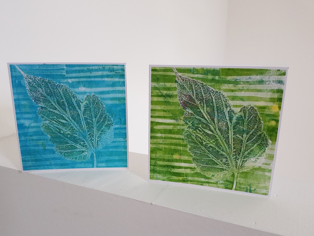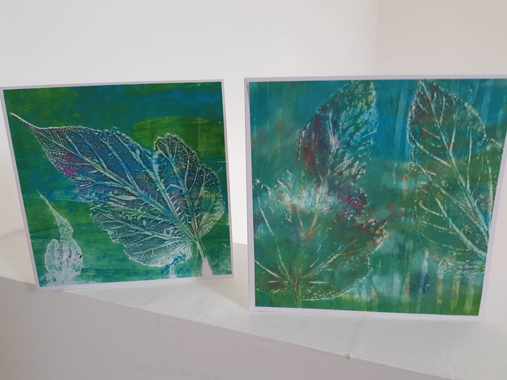 Het leukste is als er nog wat verf aan het blad zit en je gebruikt het blad voor een volgende print, je ziet dat goed bij de meest linkse en de meest rechtse kaart hieronder. Klik op de foto om hem te vergroten.