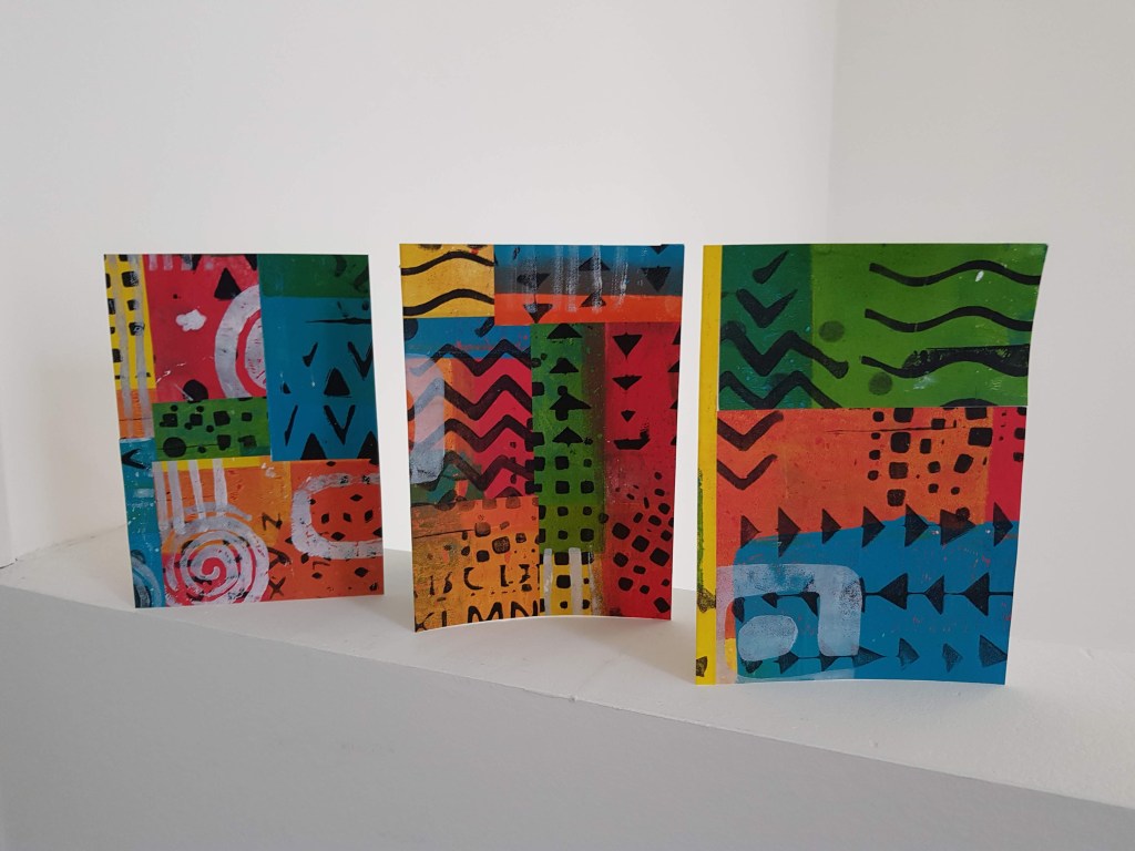 Gisteren heb ik weer totaal andere kaarten gemaakt. Eerst een paar vellen papier met verschillende kleuren bedrukt, daarna met zwart en wit gestencild en gestempeld. Vervolgens de vellen in stukken geknipt en hier weer collages van gemaakt, een vrolijk stel kaarten.
