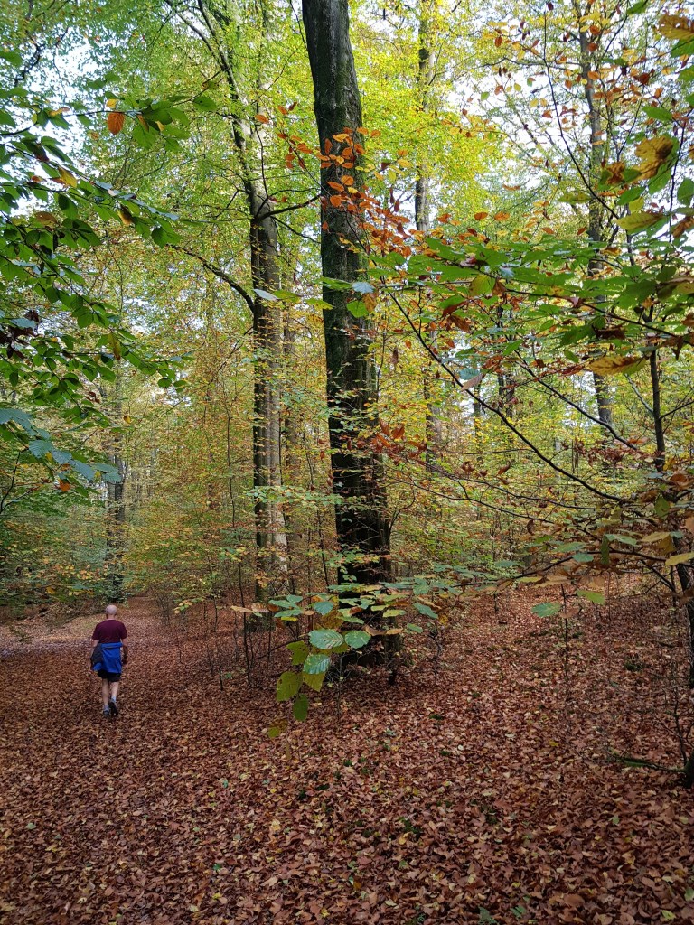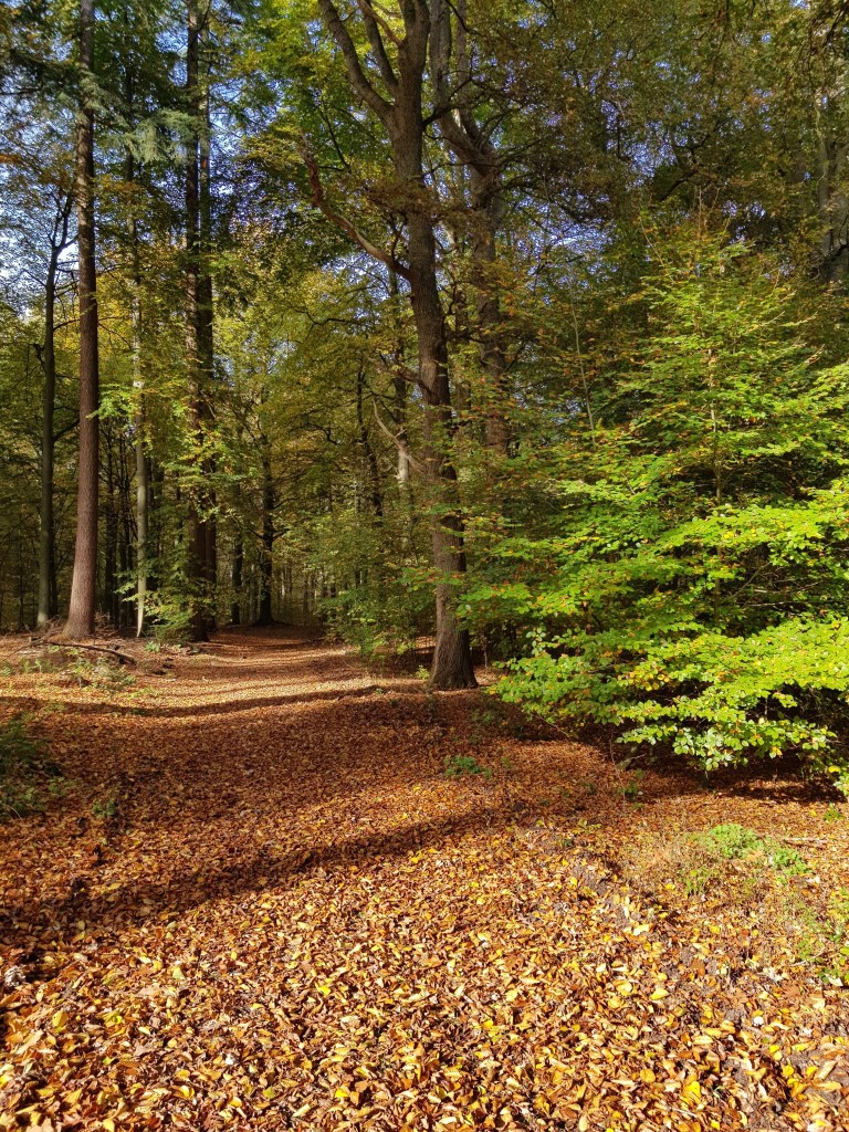 Het zonnetje scheen door de bomen en de bladeren leken wel van goud. We waren soms gewoon het pad kwijt door al die bladeren.