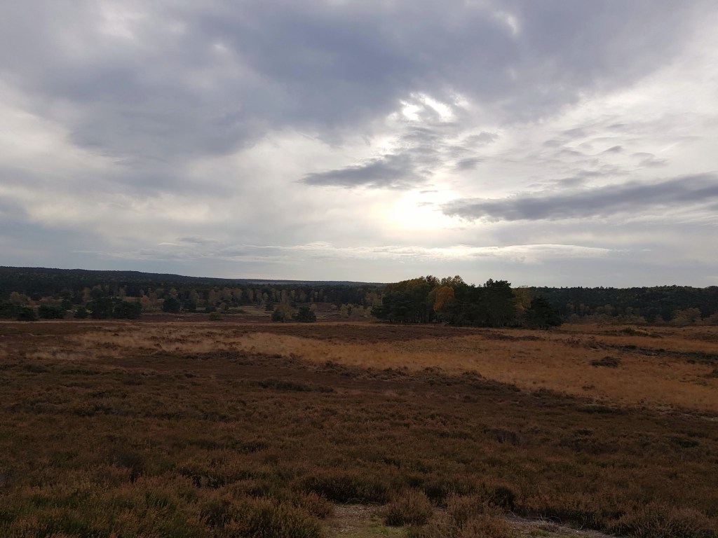 Het grootste deel van de tocht liep door het bos, maar even over de helft was een open stuk met heide en konden we wat verder van ons afkijken.