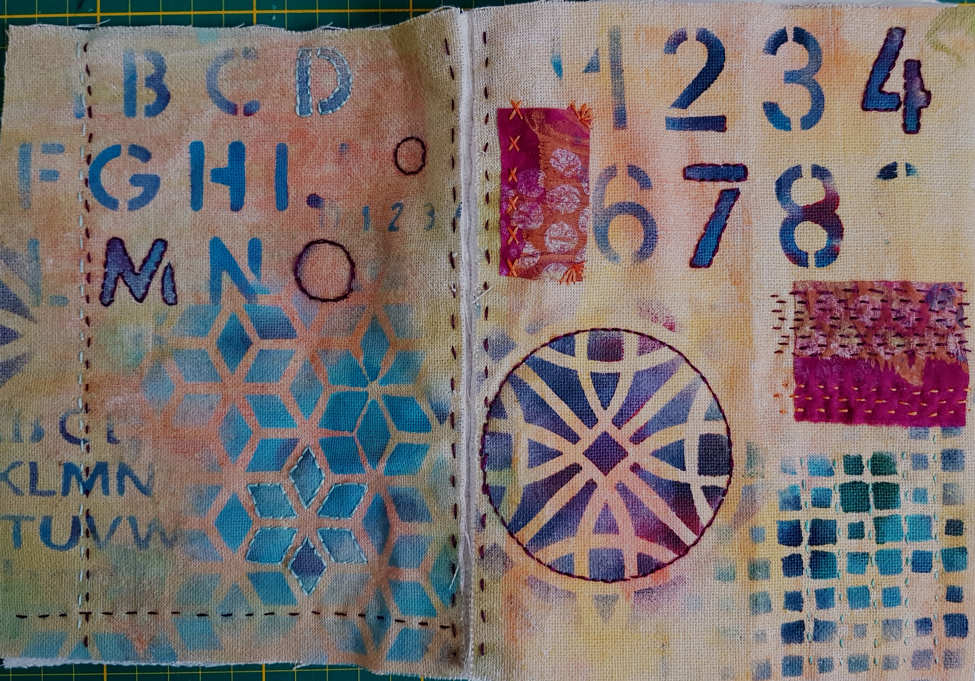 De achtergrond is eerst geverfd met de gelli plate en bewerkt met sjablonen, daarna voeg ik hier en daar borduursteken toe om het lapje vast te zetten op de flanel.