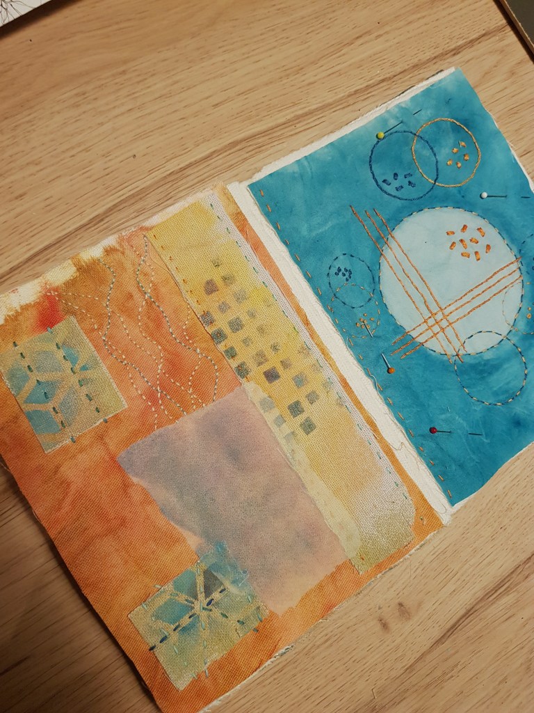 Dinsdag waren we weer bij elkaar met Achterdoek. We gaan allemaal een boekje maken van textiel en hebben dinsdag wat achtergronden gemaakt met de gelli plate op stof.