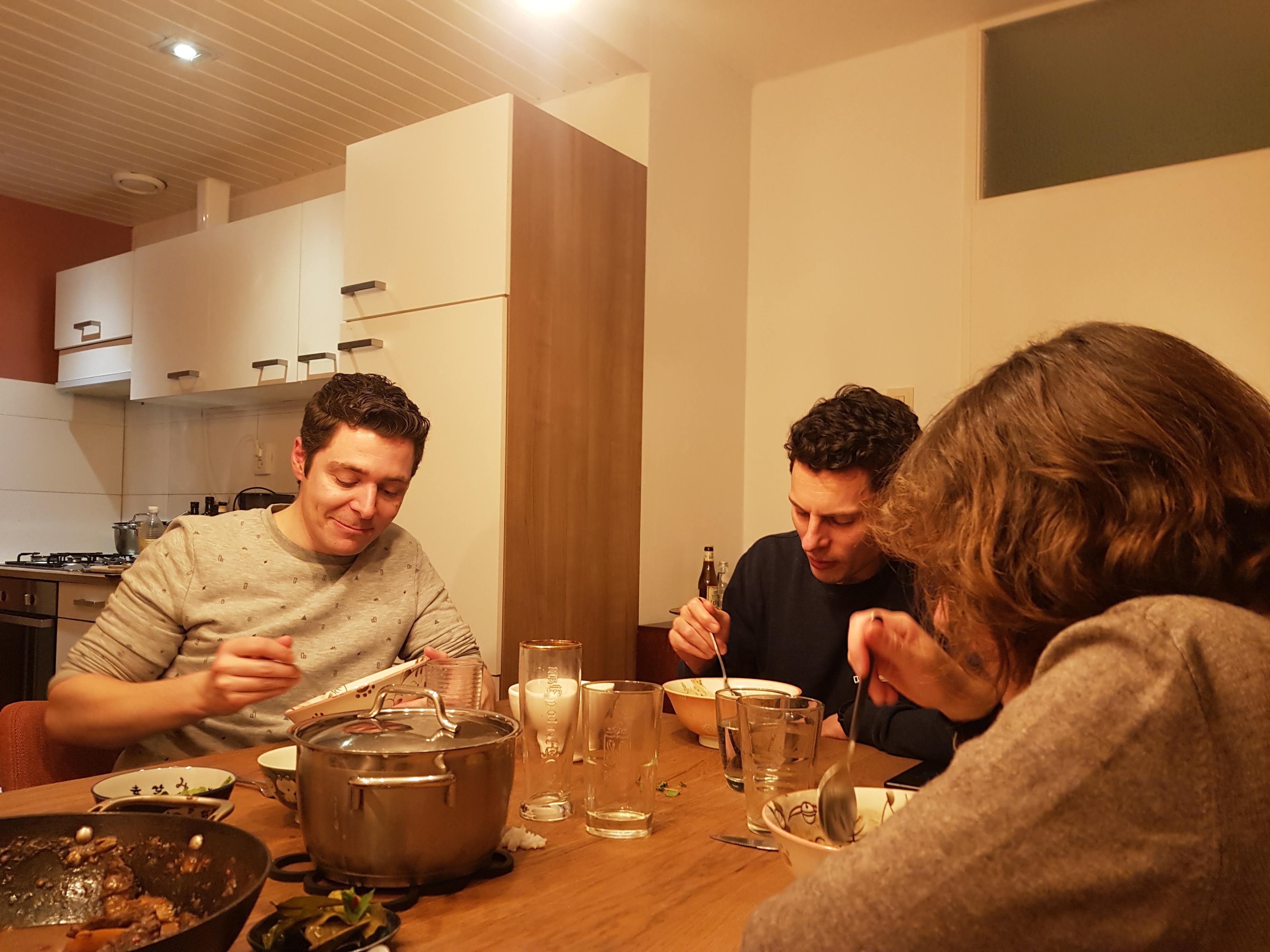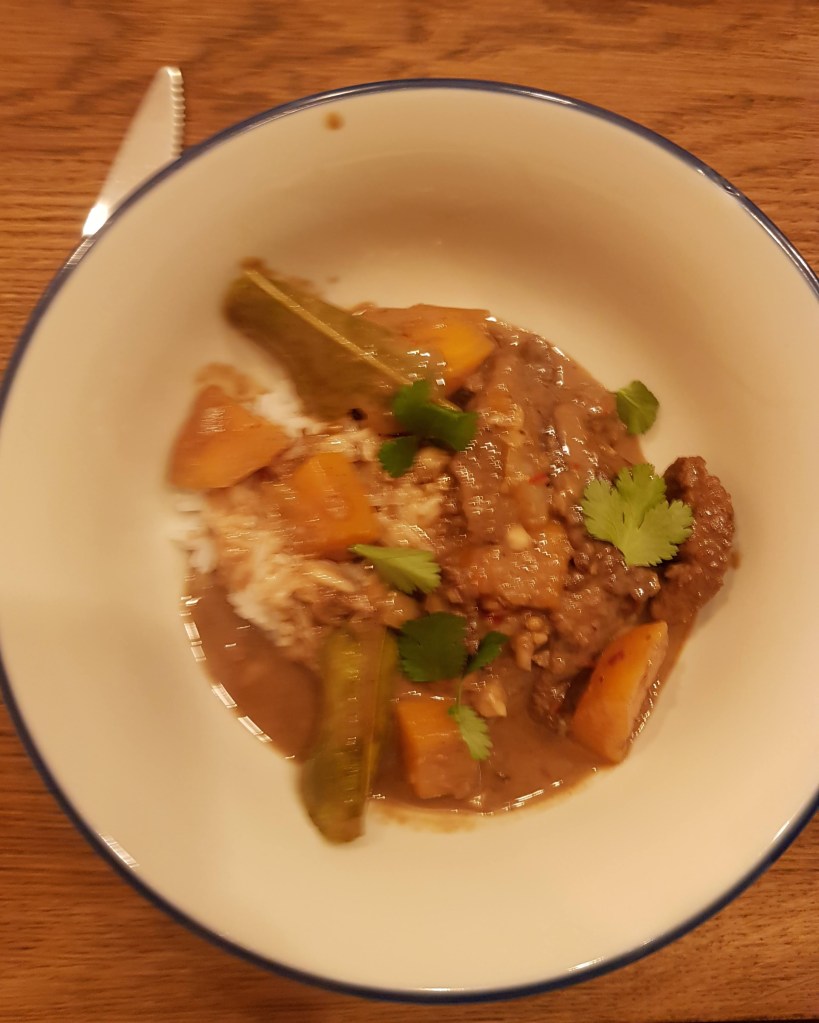 Ze konden allemaal nog een flesje mee naar huis nemen. Daarna hadden we een heerlijke Thaise soep met garnalen en kokosmelk en Massaman curry met rijst. De foto’s zijn niet zo scherp, maar het smaakte prima, we hebben er allemaal van zitten smullen.