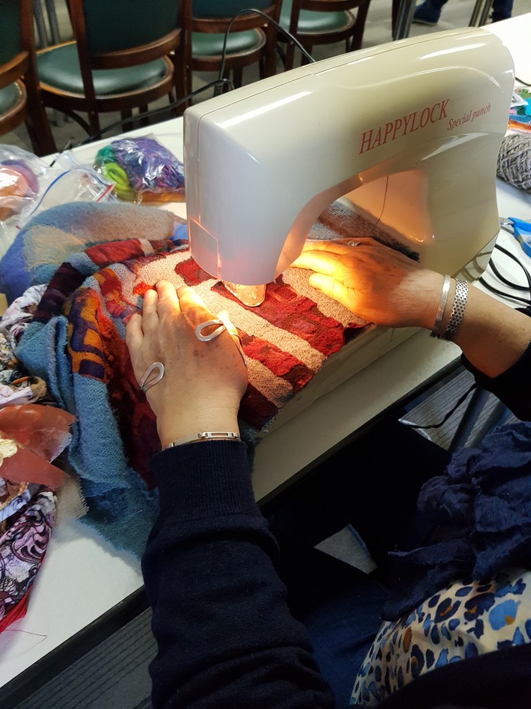 Later heb ik er nog meer borduursteekjes aan toegevoegd. Van Annemiek mocht ik oefenen met haar machine, dit is een proeflapje, met verschillende stofjes en draden op een stuk van een oude trui.