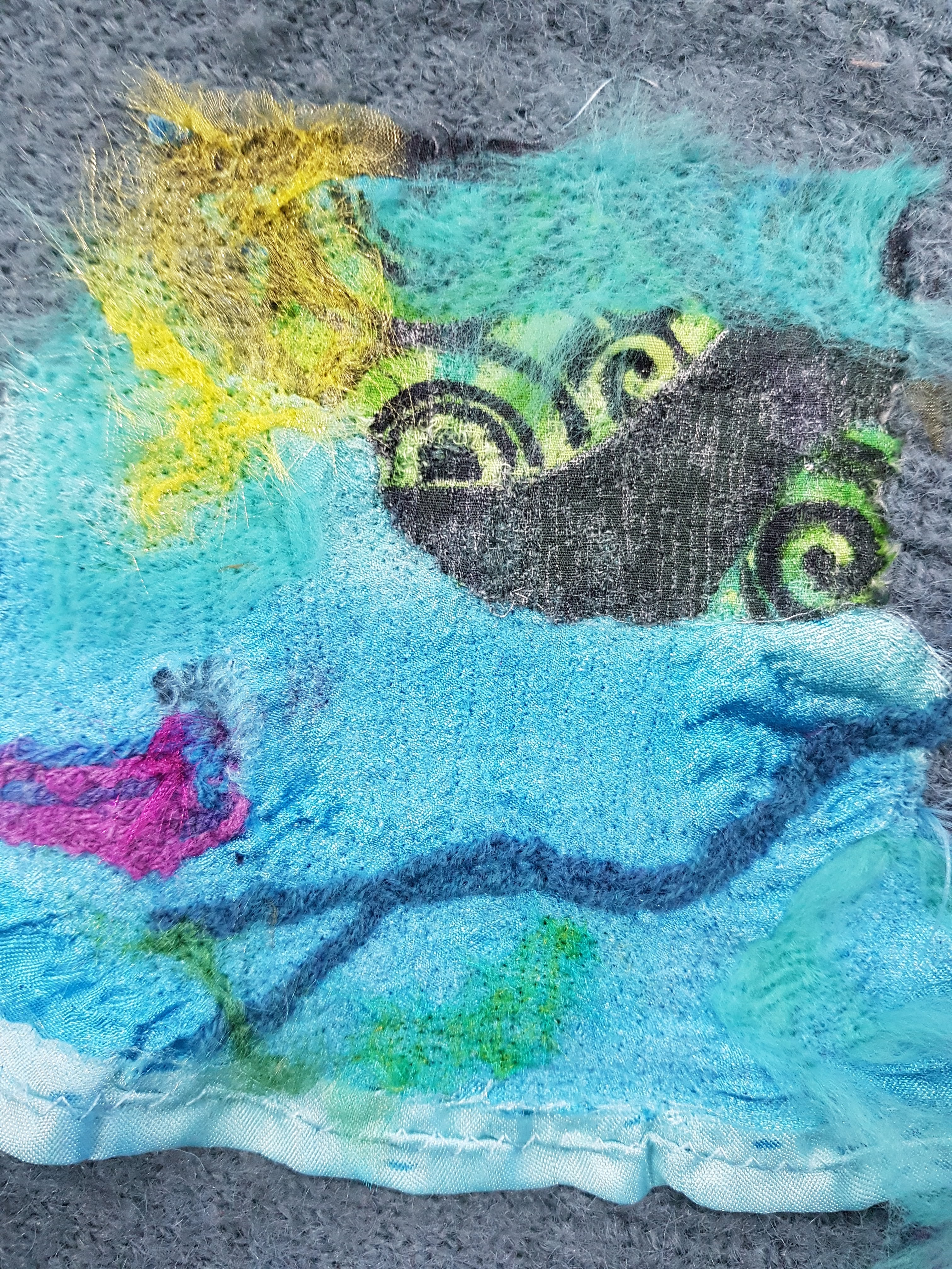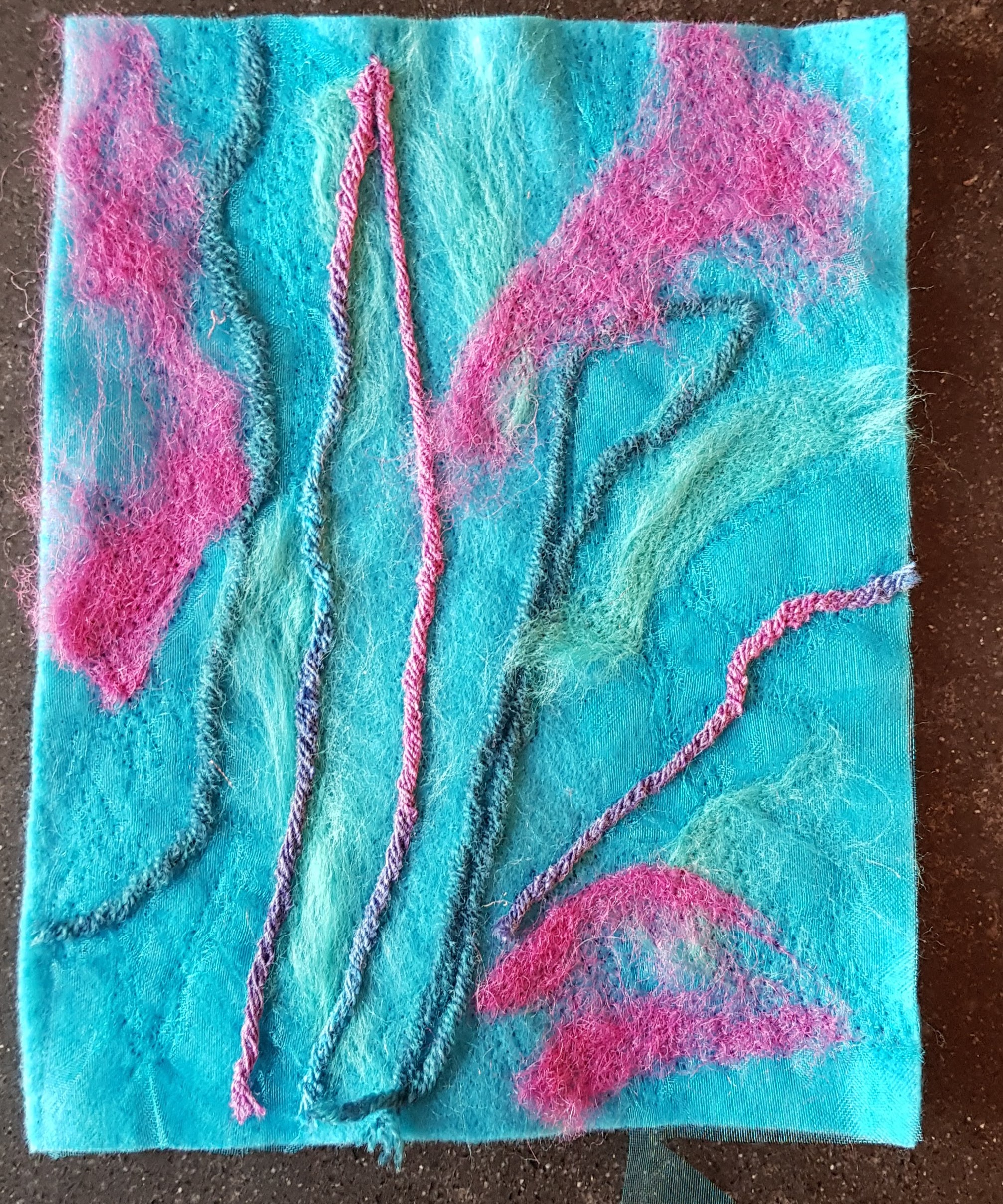 Ook heb ik nog een vilten lapje bewerkt met organza en draden.