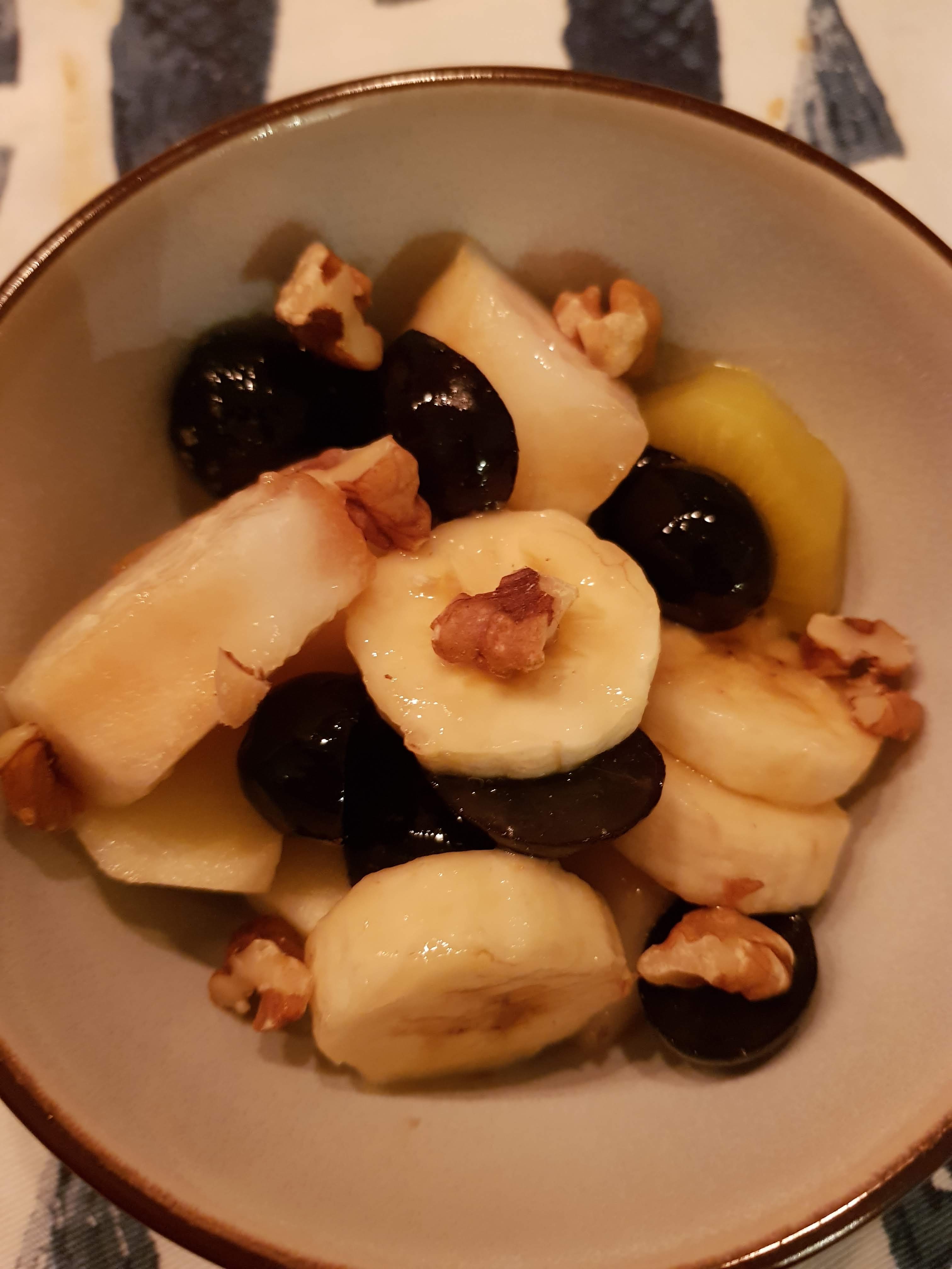 Allerlei soorten fruit klein snijden, een paar lepels honing losroeren met een eetlepel citroensap en dit door het fruit scheppen plus wat gehakte walnoten. Wel een tijdje laten intrekken.