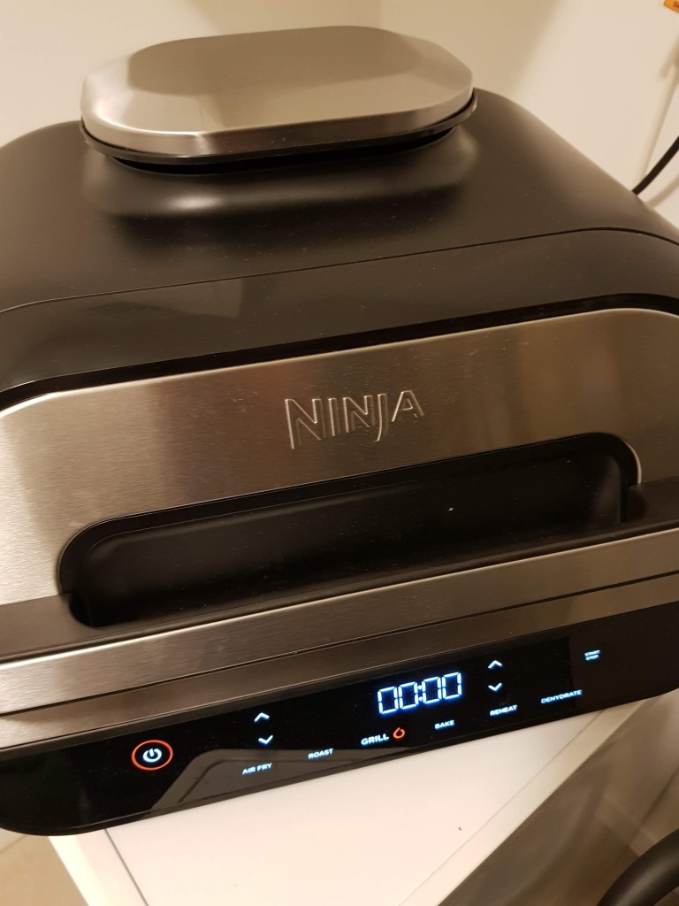 Vorige maand hebben we een air fryer aangeschaft nadat we bij de consumentenbond gekeken hadden welke er goed uit de bus kwam. We kochten een Ninja Foodi Max Grill & Air Fryer. Hij ziet er wat anders uit dan de meeste air fryers, er zit namelijk geen lade in maar je doet het deksel omhoog. Als nadeel werd genoemd dat hij vrij zwaar is maar dat maakt voor ons niet uit omdat hij op een vaste plek staat.