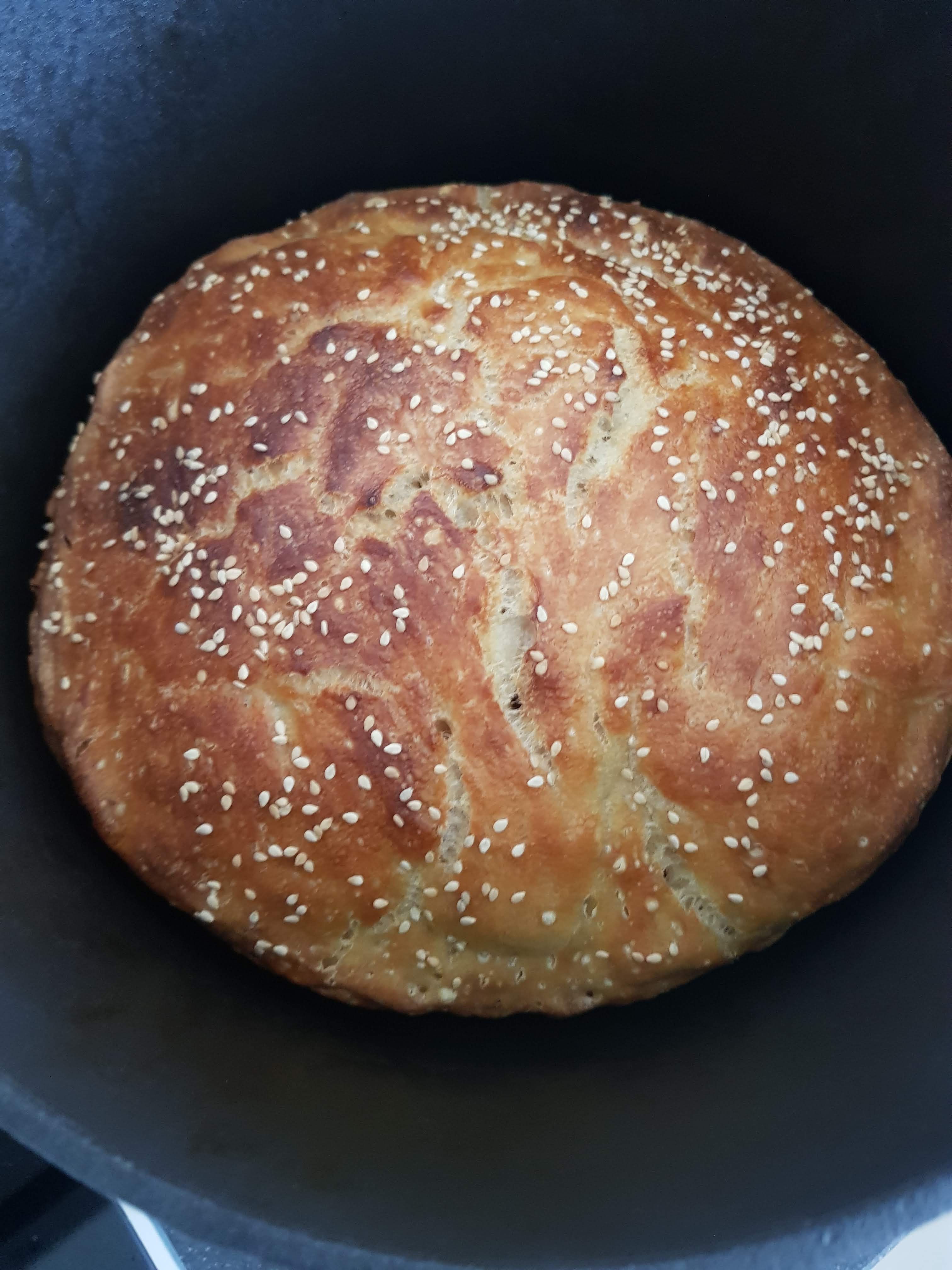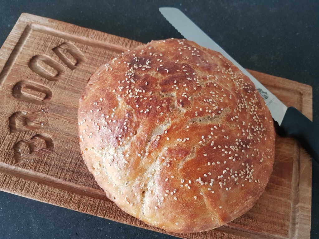 Een tijdje terug maakte ik een no knead brood, dat hoef je dus niet te kneden en afgelopen weekend heb ik het weer eens gedaan, deze keer naar een recept van Karin Luiten. Zaterdagavond heb ik het deeg gemaakt, waarbij je dus alles alleen door elkaar hoeft te roeren en zondag kon het de oven in. Je bakt het dan in een gietijzeren pan.