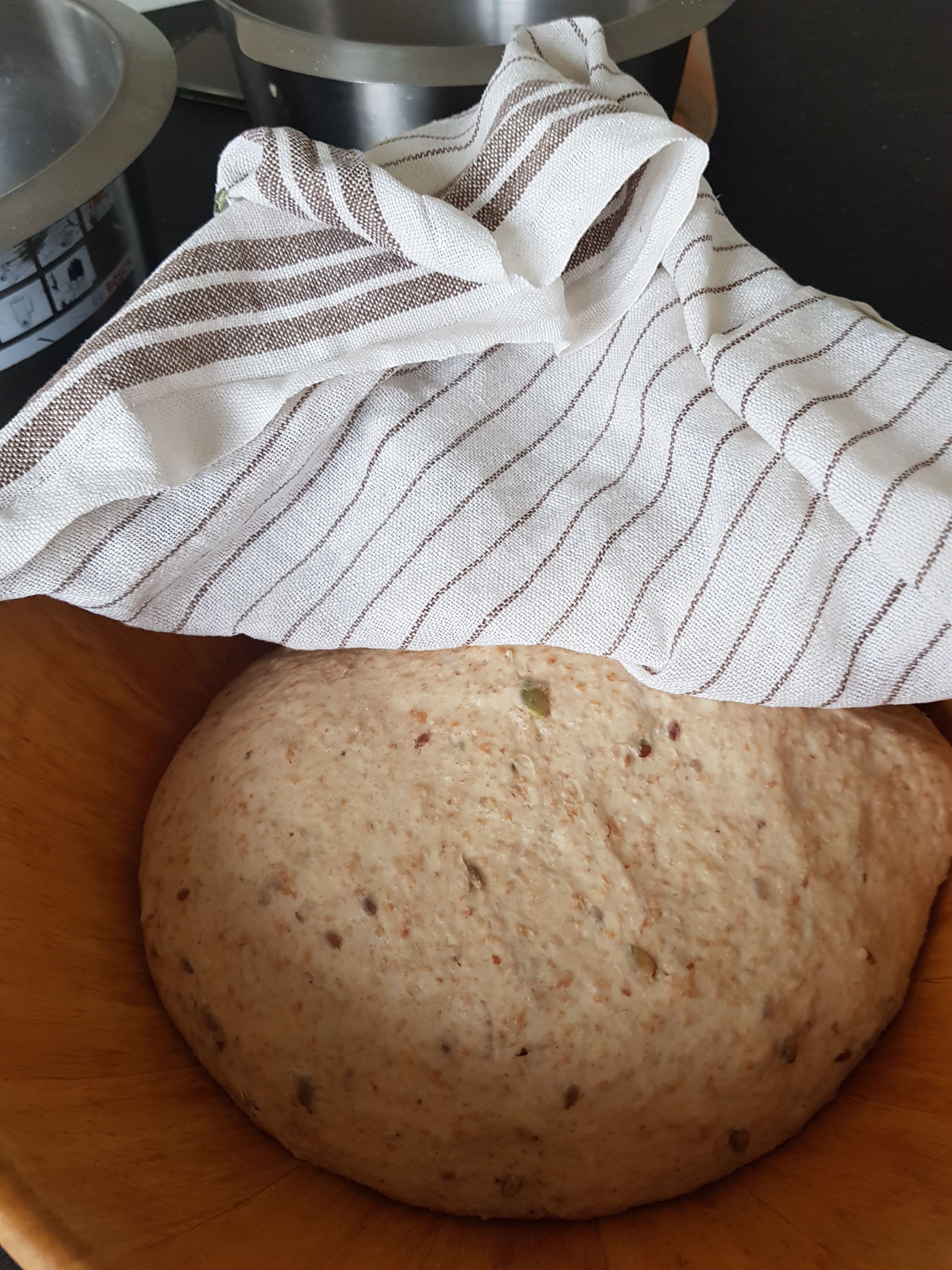 Al jaren bakt Aat elke week twee broden, ik denk al zo’n 10 jaar. Eerst met de broodbakmachine, maar later gewoon in de oven. Het deeg wordt gekneed met de keukenmachine, de rest doet hij zelf. Het duurt een hele ochtend voor het brood klaar is, hier staat het deeg te rijzen.
