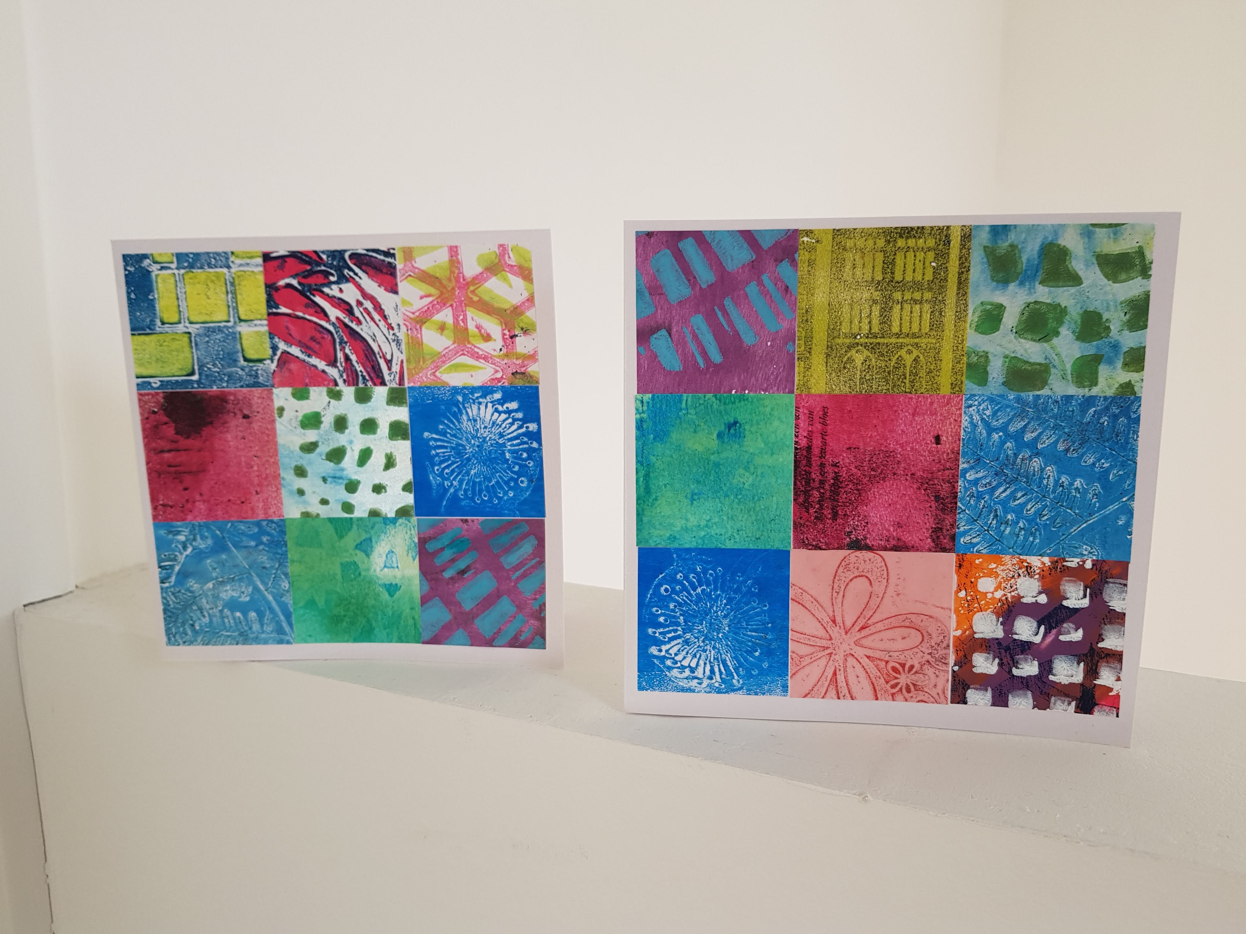 Ik heb de gelli plate weer eens tevoorschijn gehaald en van de prints wat kaarten gemaakt.