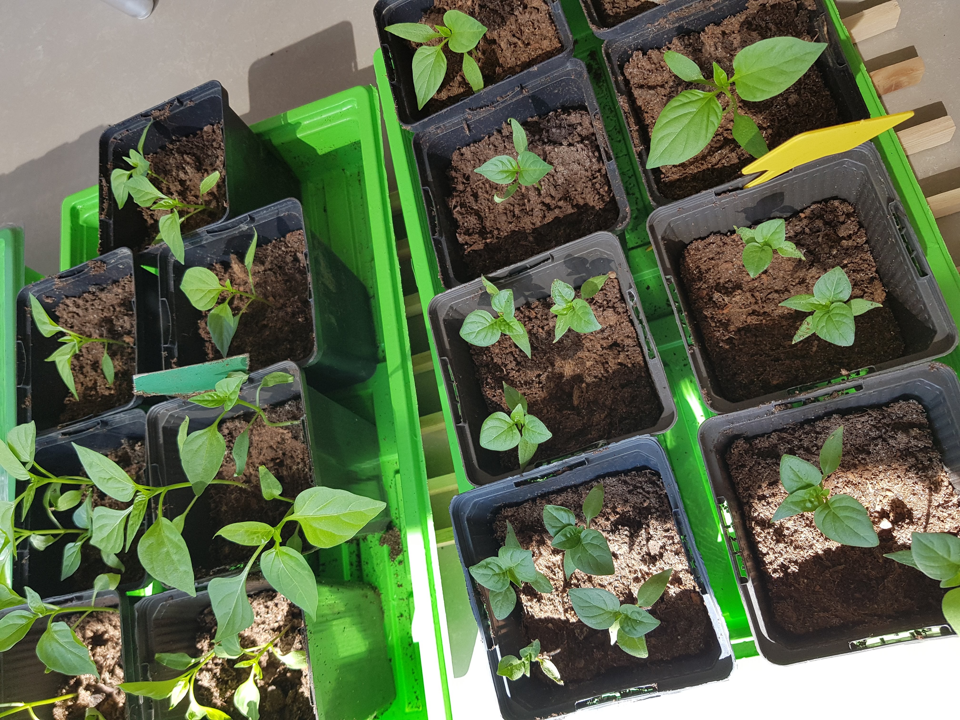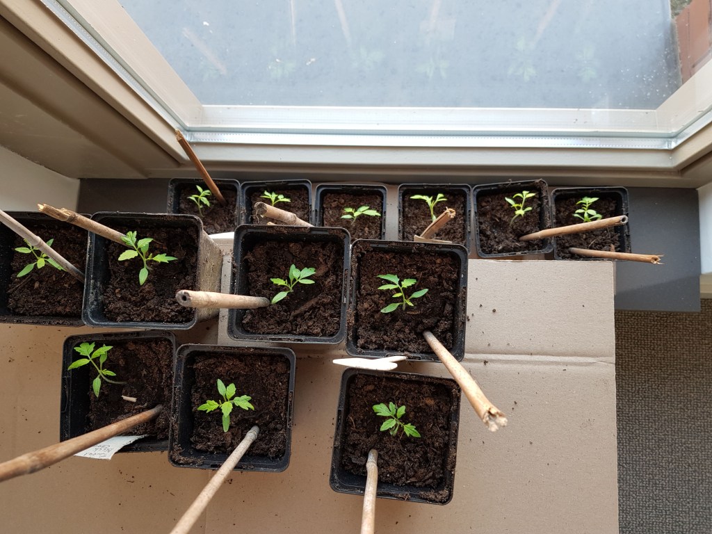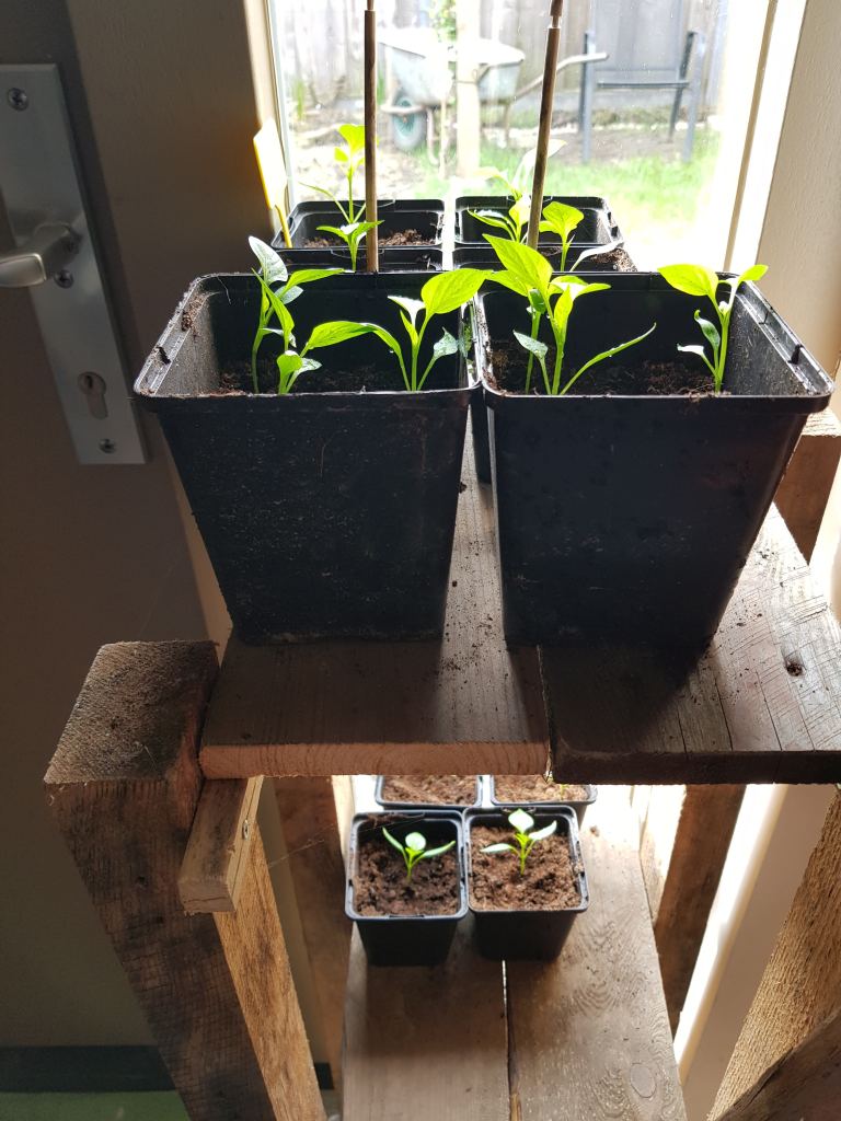 Overal in huis staan potjes met zaaigoed: 3 soorten paprika’s, pepers en 4 soorten tomaten. Beneden hebben we geen vensterbanken, dus staan ze op de grond voor het raam, boven kunnen ze wel in de vensterbank en in de garage staan ze op een stellage voor het raam. De tomaten: