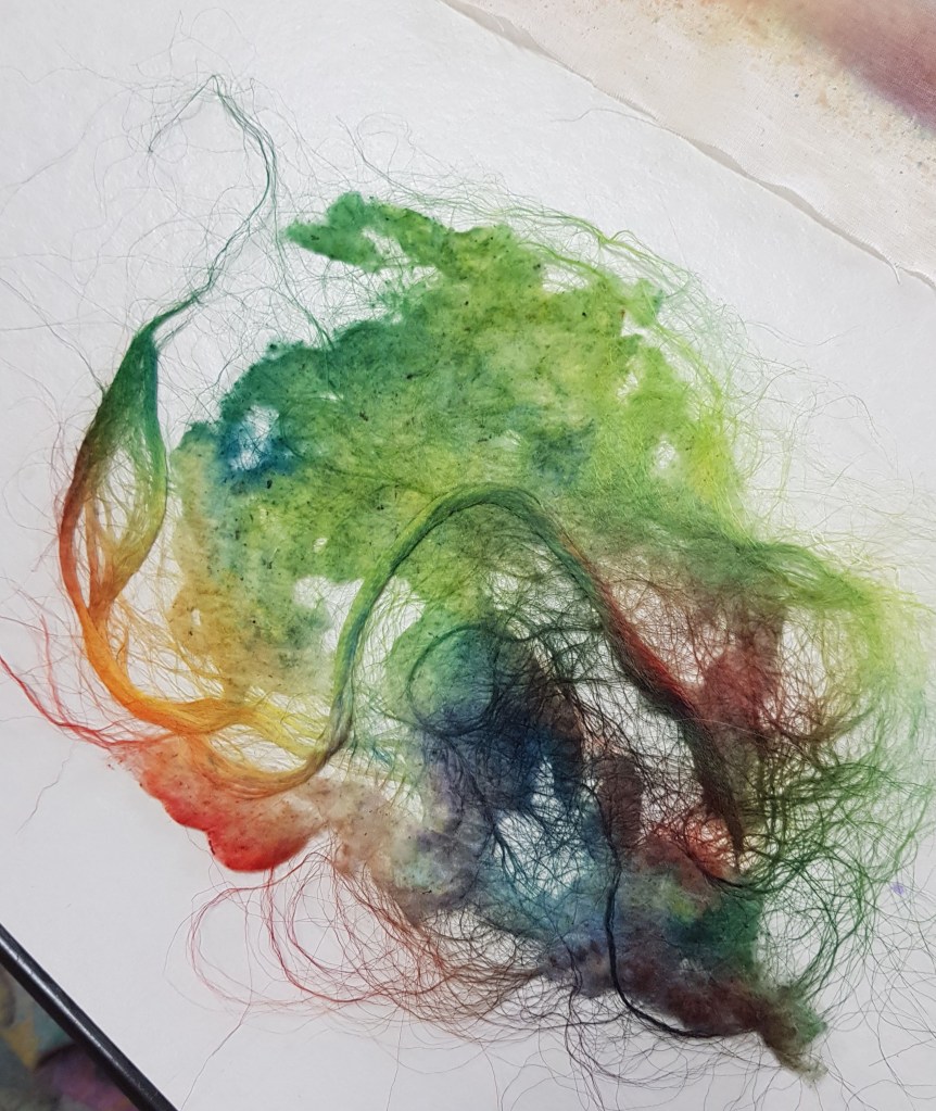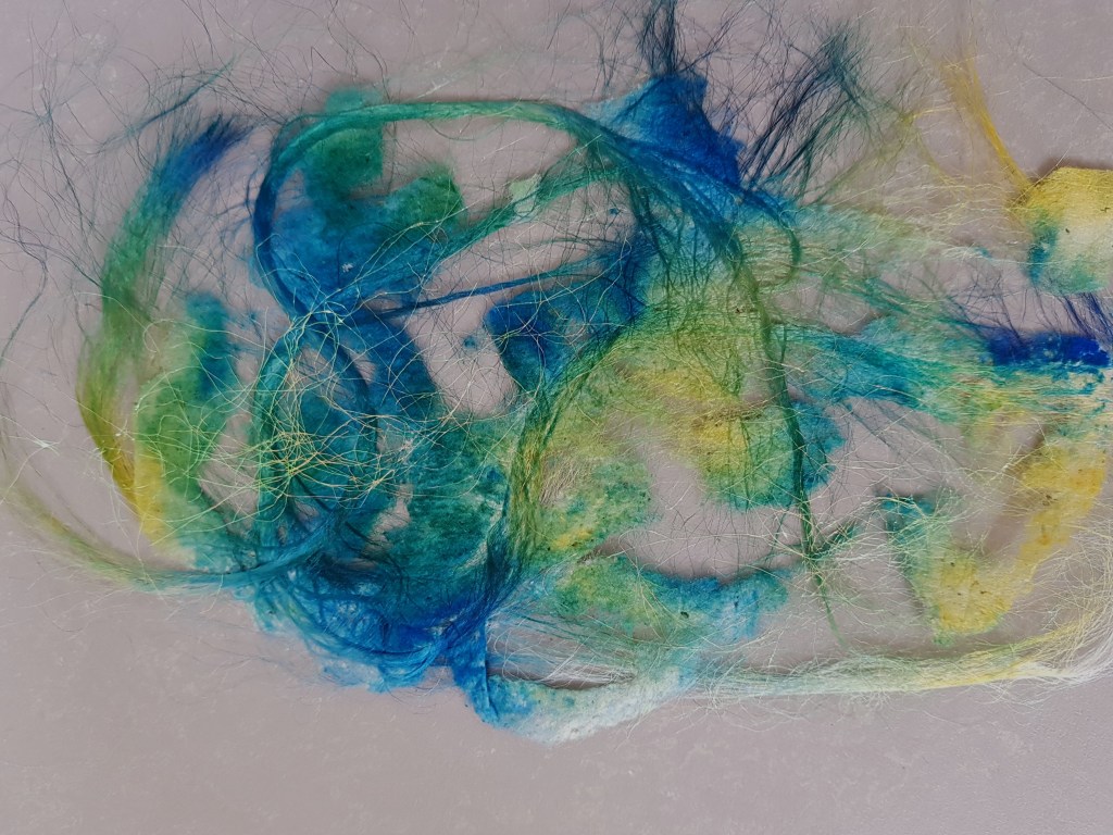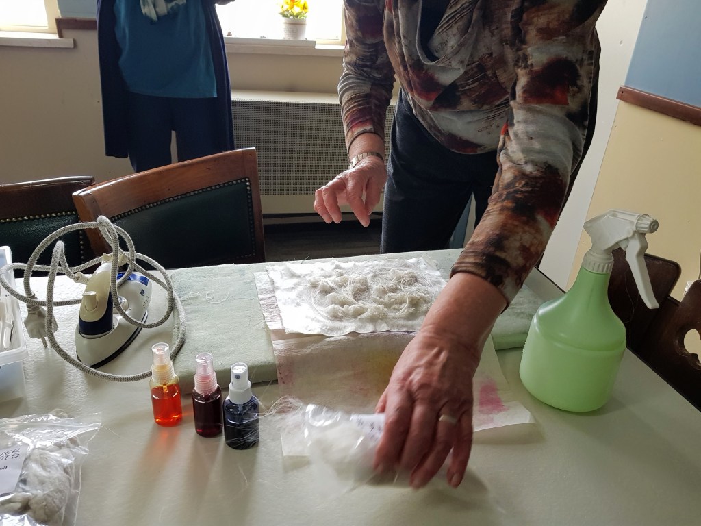Je legt eerst de vezels op een lapje, maakt alles nat en spuit de verf erop. Dan met bakpapier ertussen strijk je totdat het droog is. Dit zijn mijn werkjes, eerst zonder ondergrond, dan op een gekleurde lap.